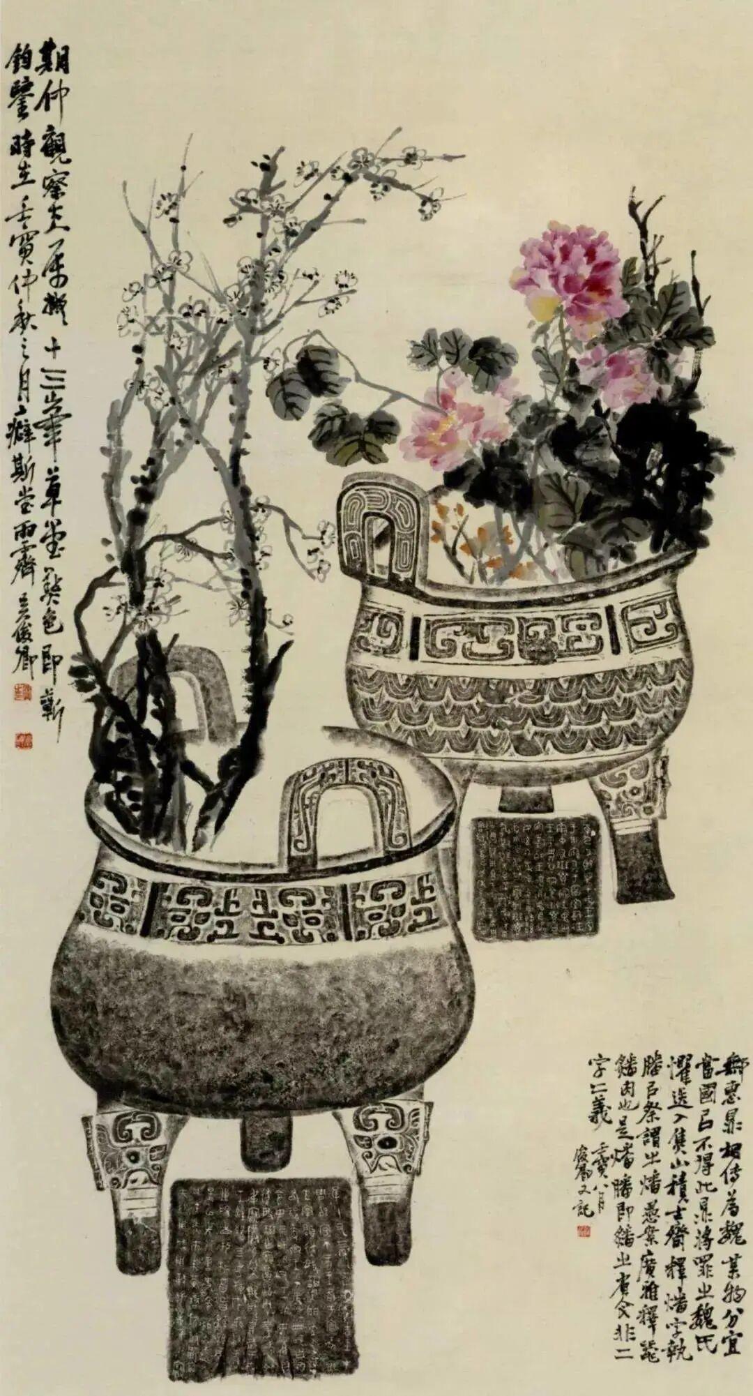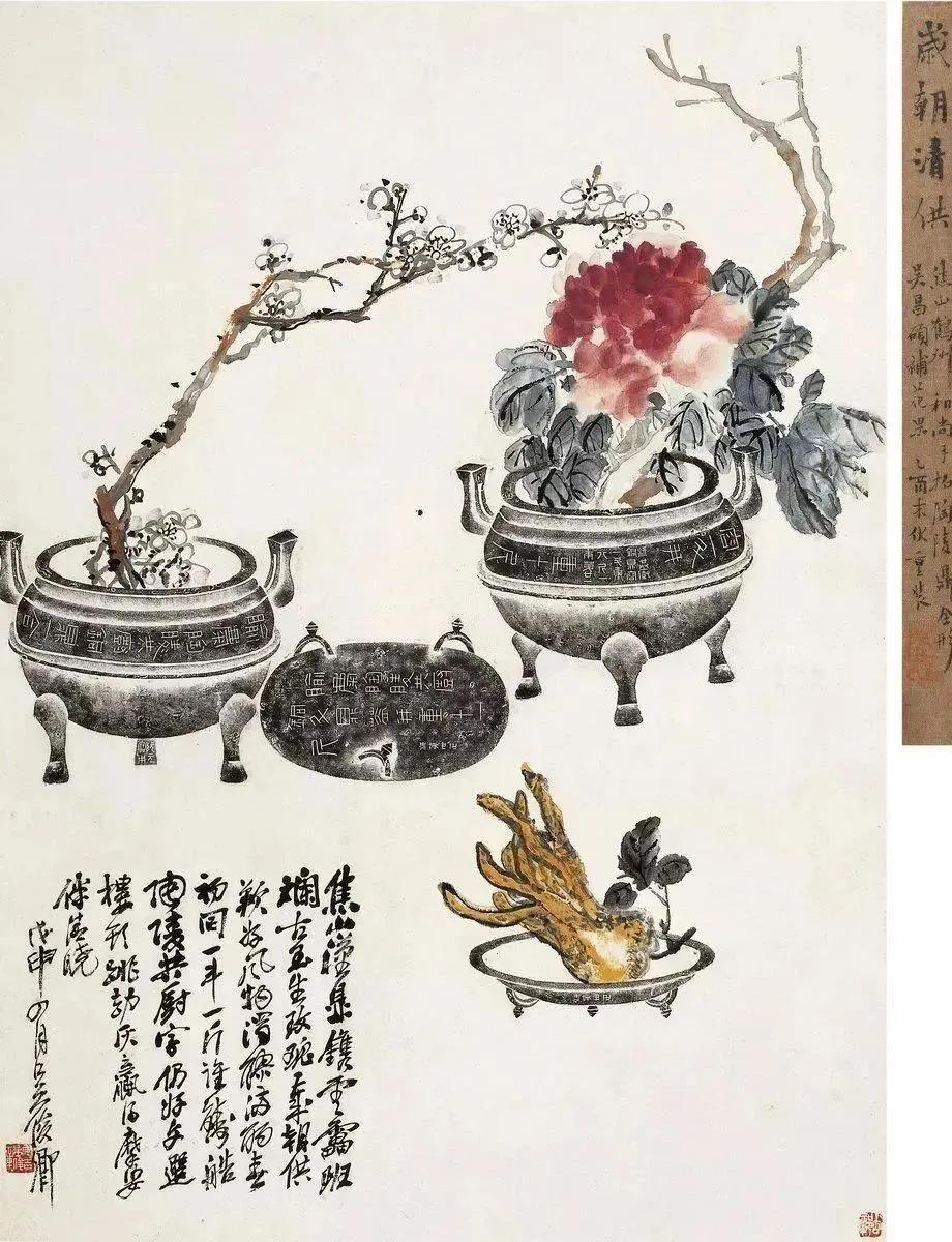 [玫瑰]古语|原文:穷则独善其身,达则兼济天下。——《孟子》 译文:不得志的时候就要管好自己的道德修养,得志的时候就要努力让天下人都能得到好处。 感悟:前半句显示出道家的豁达态度与出世境界,而后半句表达了儒家的理想主义和入世精神。 [玫瑰]赏画|吴昌硕青铜花卉图,别开生面 图一:浙江省博物馆藏《鼎盛图》轴,作于1902年,吴昌硕时年50岁,这是一件绘画与青铜器全形拓相结合的作品。古铜器拓片斑驳醇厚的墨色,与吴昌硕古拙艳丽的花枝相得益彰,可谓传统花卉题材绘画中的一朵奇葩。传统文化国学智慧 绘画