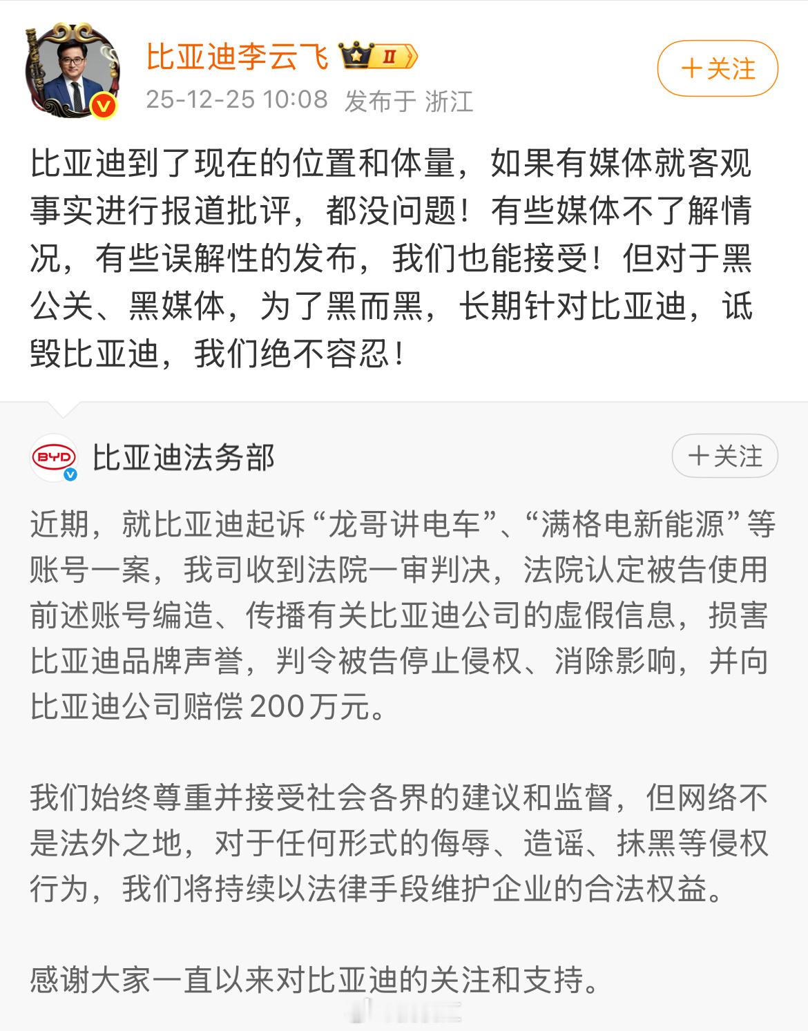 近日,比亚迪起诉“龙哥讲电车”等账号侵权案一审判决结果公布了,认定被告编造传播虚假信息损害品牌声誉,判令停止侵权并赔偿200万元。这已是比亚迪多次维权胜诉,此前也有多个账号均因恶意诋毁被判赔偿。比亚迪集团品牌及公关处总经理李云飞也转发了这条公告。可以看到态度一直很明确:接受客观监督与合理批评,但对为黑而黑,长期针对和诋毁比亚迪的行为,是零容忍。从悬赏5万至500万元征集线索到坚决起诉维权,迪厂坚持用法律武器捍卫品牌正当权益。此次胜诉不仅为比亚迪挽回声誉,更给新能源汽车行业划定言论红线,倒逼行业评论回归理性,为整个新能源汽车产业的健康可持续发展筑牢舆论根基。