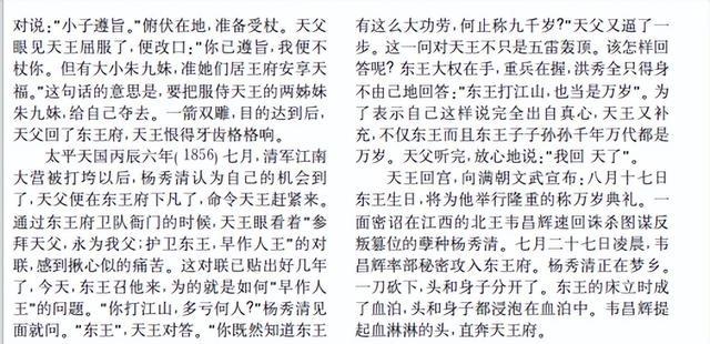 在天京事变爆发前,杨秀清已经做到了集三权为一身。他控制了太平天国绝大多数的军队,对所有将领拥有生杀予夺之权,势力已经发展到了可怕的地步。再加上外有天父身份作祟,就算是洪秀全也不可能正面斗得过杨秀清。 杨秀清出生在广西桂平一个穷山沟里,大概是1823年,家里穷得叮当响,早年靠烧炭过日子,没上过学,不会认字。1840年代,清朝乱成一锅粥,鸦片战争后老百姓日子更苦,杨秀清碰上洪秀全搞的拜上帝会,就加入了。 起初他没啥名气,但很快就靠装神弄鬼的本事出头。1848年,冯云山被抓,洪秀全出去救人,杨秀清在聚会上突然来了一出天父附体,稳住了大家的心,从那以后他的地位蹭蹭上涨。金田起义时,他帮着组织后勤,太平军突围永安,他出了不少主意。1851年,洪秀全封他东王,管着其他王,杨秀清就开始抓军权,指挥打仗,攻下武昌和南京这些大城。 他作风狠,对手下不满意就杖责或杀头,太平军里很多人怕他。定都南京后,杨秀清管政务、军队,还用天父名义发号施令,洪秀全基本不管事。他提拔了李秀成、陈玉成这些将领,但没养成死忠的队伍。他的家族底子薄,没兄弟帮衬,全靠自己折腾。杨秀清的骄横让内部矛盾越来越多,诸王之间关系紧张。到1856年,他权力大到顶点,但也埋下祸根。 太平天国定都南京后,杨秀清就把政教军三方面都抓在手里,当了实际的老大。洪秀全躲在宫里不管事,所有文件先过杨秀清的手,他批了才算数。宗教上,他老用天父附体这招,甚至让洪秀全跪着听话,强化自己的地位。军队方面,他管着大部分兵马,将领的命都在他一念之间,不听话的直接处置。1856年夏天,太平军打败清军江南大营,杨秀清的势力更强,他派亲信守城门,控制进出。他的命令比洪秀全的印章还管用,军队调动全听他的。 杨秀清的野心越来越大,他借天父名义逼洪秀全封他万岁,等于要平起平坐。洪秀全表面答应,但心里清楚,正面对抗不行,杨秀清兵多将广,还占着宗教优势。杨秀清的权力让太平天国内部平衡打破,其他王如韦昌辉、石达开被他打压,怨气积累。 杨秀清逼封万岁的事传开,洪秀全通过陈承瑢知道他的计划。陈承瑢是杨秀清提拔的,但被杖责过,怀恨在心,就倒戈密报。洪秀全秘密召韦昌辉和石达开回京。1856年9月1日,韦昌辉带三千兵从江西赶来,陈承瑢开门放他们进城,直接杀到东王府,杨秀清被砍头,全家和亲信被杀。韦昌辉接着大开杀戒,借清余党名义杀了上万东王的人。石达开回来劝阻,反被韦昌辉追杀,逃出天京,家人被害。 洪秀全见事闹大,下令杀韦昌辉,事变结束,太平天国死伤惨重,损失两万多人。事后,太平军分裂,石达开带兵出走,洪秀全重用自家兄弟,内部更乱。清军趁机反攻,太平天国从盛转衰。 1859年,洪秀全给杨秀清平反,设东王升天节,让他儿子继承爵位,但大局已定。1864年,南京被湘军攻破,洪秀全病死,李秀成被抓,太平天国灭亡。这场内斗让清朝捡了便宜,本来太平军有机会北伐,但自己毁了自己。