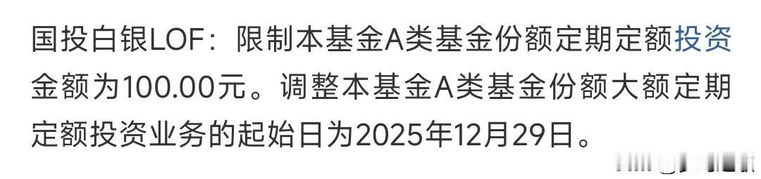 开始给白银降温了,限定定投金额 12月29日起,国投白银LOF的A类份额定投上限