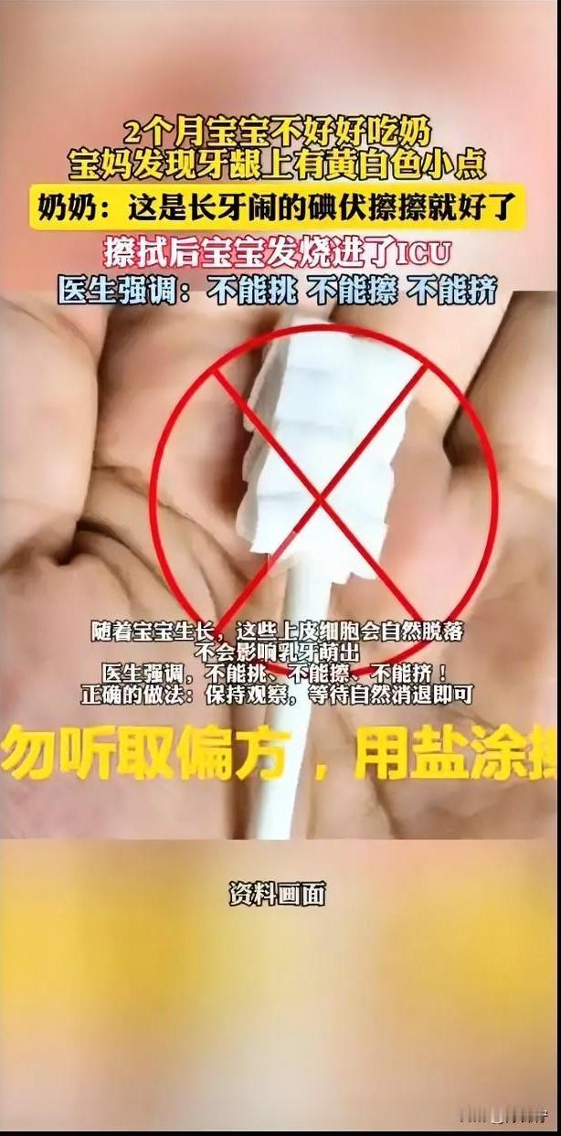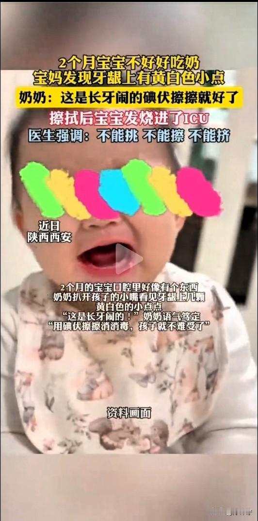 西安两个月宝宝进ICU,只因奶奶“好心”办了坏事!宝宝牙龈上的“小白点”千万别乱碰! 2个月的小宝宝不好好吃奶,宝妈发现娃牙龈有黄白色小点,奶奶本着“过来人”的经验,说这是长马牙了,拿碘伏给娃擦了擦。 结果碘伏擦完没一会儿,宝宝突然剧烈哭闹、额头烫得吓人,连呼吸都变急促了,送医后直接进了ICU。 后来医生解释,宝宝嘴里的是“马牙”,属于新生儿正常的生理现象,会自然脱落,根本不用特殊处理。 而奶奶用碘伏擦拭的行为,直接弄破了宝宝娇嫩的口腔黏膜,引发了严重感染,这才让宝宝遭了这么大的罪。 医生更是再三强调,遇到马牙,千万别挑、别擦、别挤,静静观察就好。 养娃别盲目信偏方,遇到拿不准的情况,第一时间找医生才是最靠谱的。 陪宝宝那些事 西安 社会百态