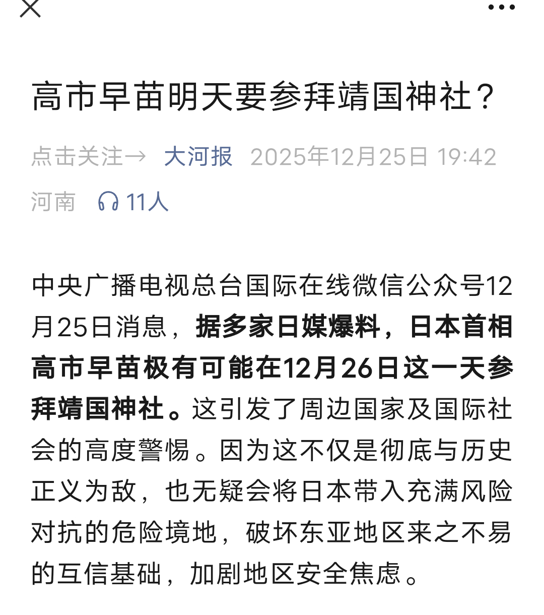 高市早苗明日或参拜靖国神社极具挑衅的日子,我们看来没把小日子打疼,她觉得自己还是很硬气?说实话对待小日子不能太客气要不然他们不知进退和悔改!高市早苗或12月26日参拜靖国神社热点观点