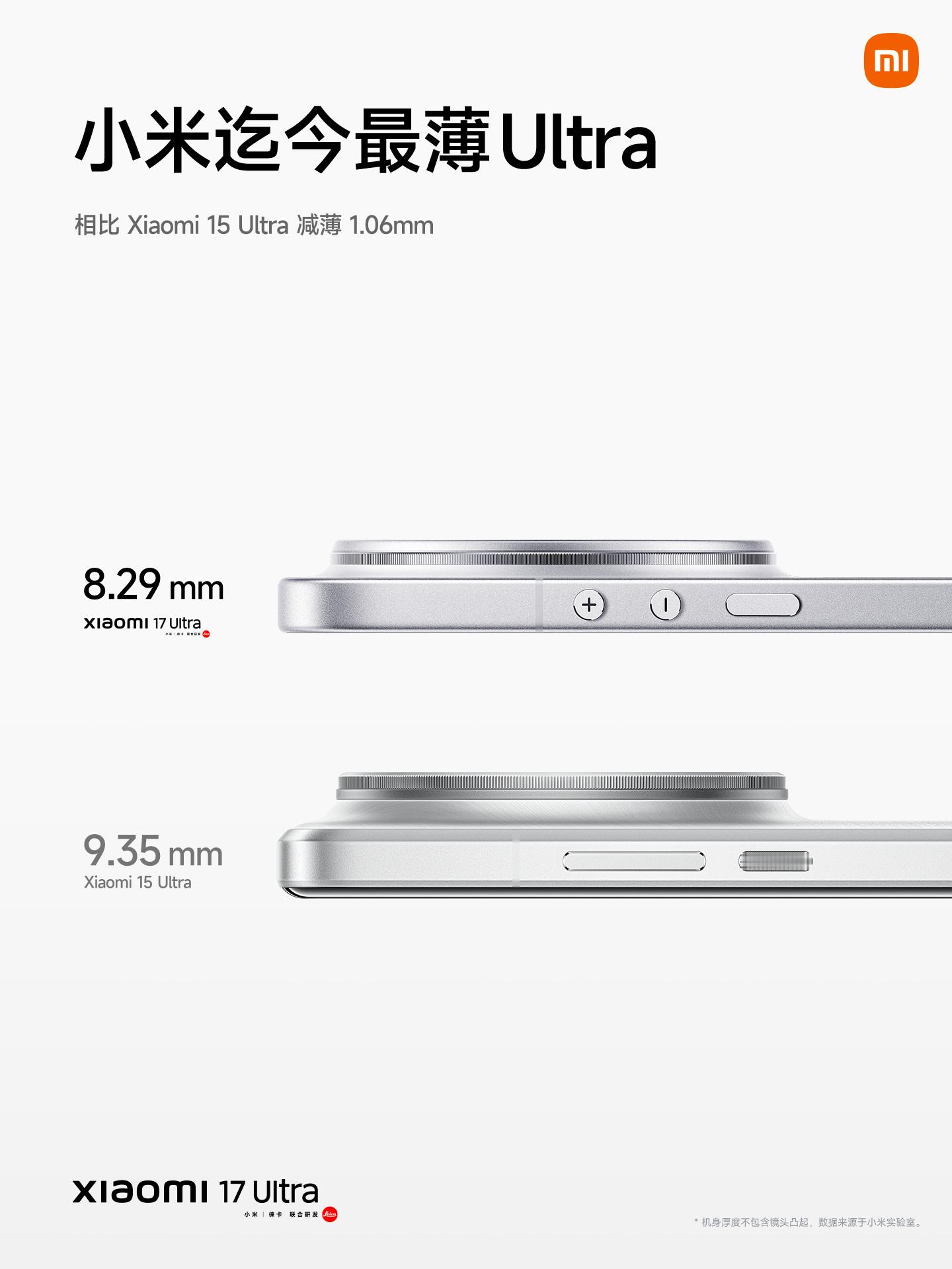 小米17Ultra是小米迄今最薄Ultra 小米17 Ultra这次厚度居然做到了做到8.29毫米,直接成了小米史上最薄的Ultra机型。相比前代减薄大约11.3%,这个幅度确实有点意外。机身设计也变了,头一回用上2D直屏和超大R角,加上包裹式金属中框和分段式音量键,手感这方面确实没得挑。别看它这么轻薄,影像配置还是旗舰级别。1英寸主摄和徕卡APO长焦镜头都给配齐了,还融合了LOFIC技术和2亿像素潜望式长焦。能在轻薄机身里塞进这种摄影能力,这实力够硬核!