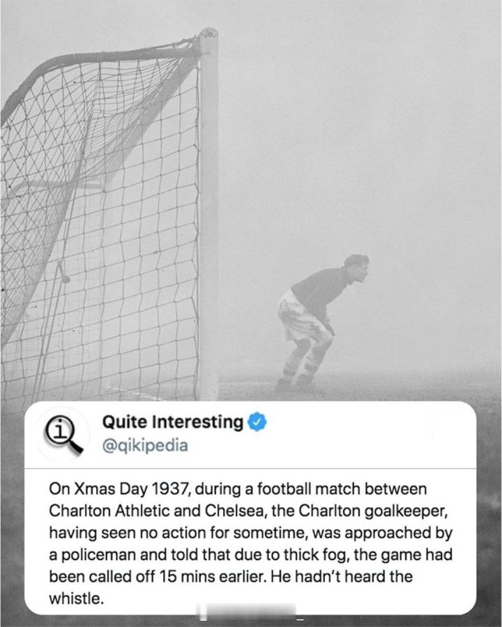 史上最敬业门将😂1937年圣诞节的一场英甲比赛中,查尔顿客场挑战切尔西,当天斯坦福桥的浓雾天气,比赛无法继续进行,于是主裁判提前中止了本场比赛。由于大雾影响,查尔顿门将巴特拉姆完全看不到场上的情况,他一直以为比赛在正常进行,全神贯注的在门前提防着可能到来的险情。直到来给球场关门的警察走近他,告诉他由于大雾,比赛15分钟前已经中止了,这时巴特拉姆才知道,原来场上已经只剩他一个人。在后来的回忆中巴特拉姆提及这件事:“下半场我越来越看不清队友,对此我一直很开心,我以为全队都在对方半场,压着对手狂攻!”萨姆·巴特拉姆是查尔顿传奇门将,保持着查尔顿出场次数最多的纪录。