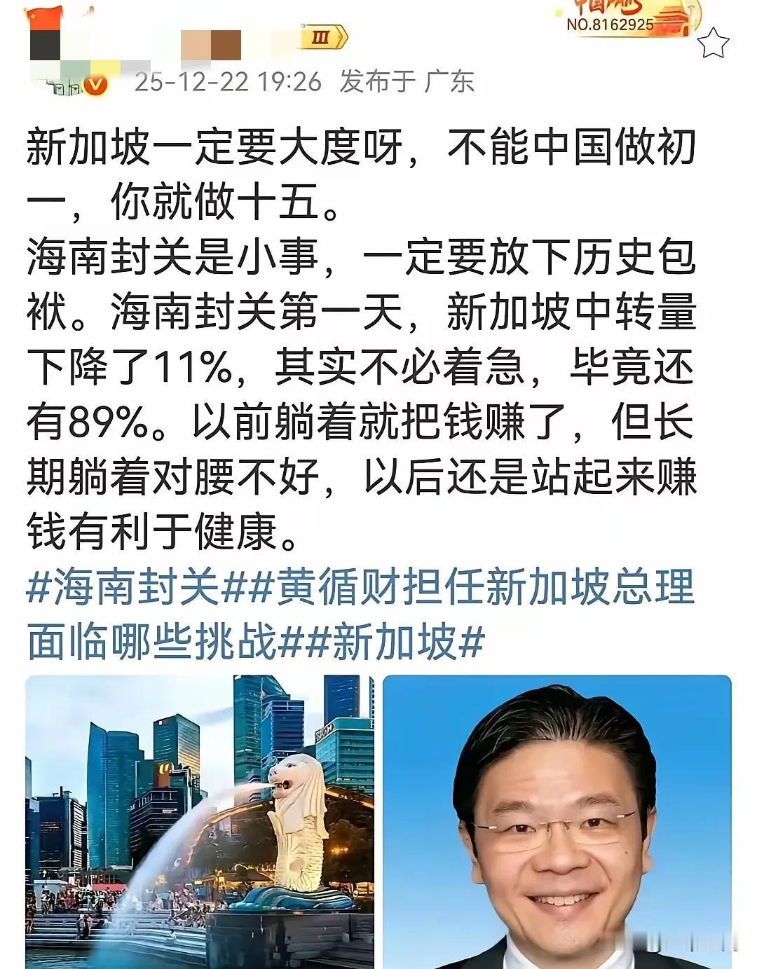 新加坡之前劝中国要大度,要放下历史,还劝我们面对美国的关税,不要报复,不要搞“你做初一,我做十五”那一套,甚至还要中国不要搞自主研发,不要搞自给自足,还是要买欧美的技术产品! 海南封关了,中国博主用新加坡之前的话术,开始劝新加坡要大度,不要报复,不要着急,不要搞“你做初一,我做十五”那套,也不要因为海南抢了你生意,就不高兴! 不得不说中国人脑子就是好用,新加坡这种拎不清自己的小国,就要用这种方式教训它,要不然还不知道自己几斤几两!