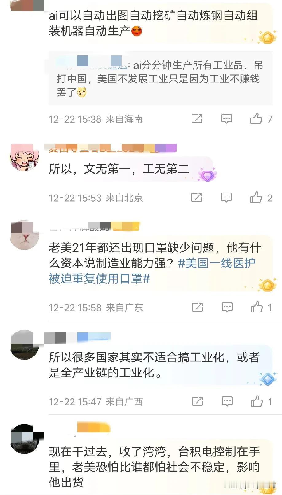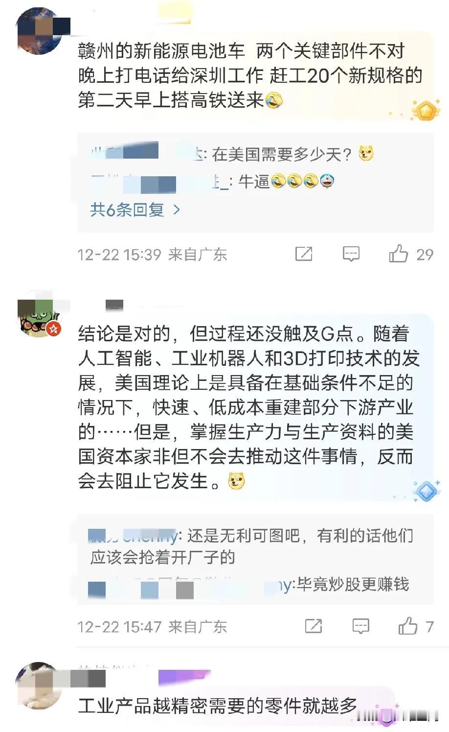 美国很难再工业化,而且美国的工业产值根本就没有意义,叫美国的军工的零部件都严重依赖中国,因为有很多零部件根本就不难,难的是成本跟效率,整个美国都找不到做这种零部件的工厂,只有中国的很多小县城在做,而你想跟中国脱钩,自己再工业化,就要从这些辛苦又不怎么赚钱的零部件开始,如果你缺乏这些东西,你很多工业品就做不出来!而且还有一个就是电力,今天美国是很难再去更新电网的,旧金山大停电,足以说明美国现在的电力供应连最基本的AI和民用电都满足不了,更何况要搞再工业化的用电量更多,所以美国不仅是更新电网,还要增加发电量,以美国目前的制度,根本就不可能完成这两个基础设施的更新!