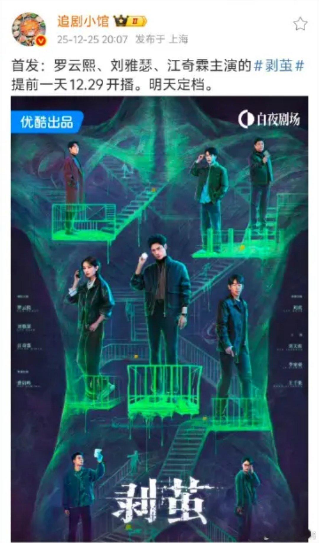 罗云熙剥茧 《剥茧》提档了,12月29日播出!!这回精彩了。月底6部大剧对打,史无前例!看看谁能脱颖而出?!