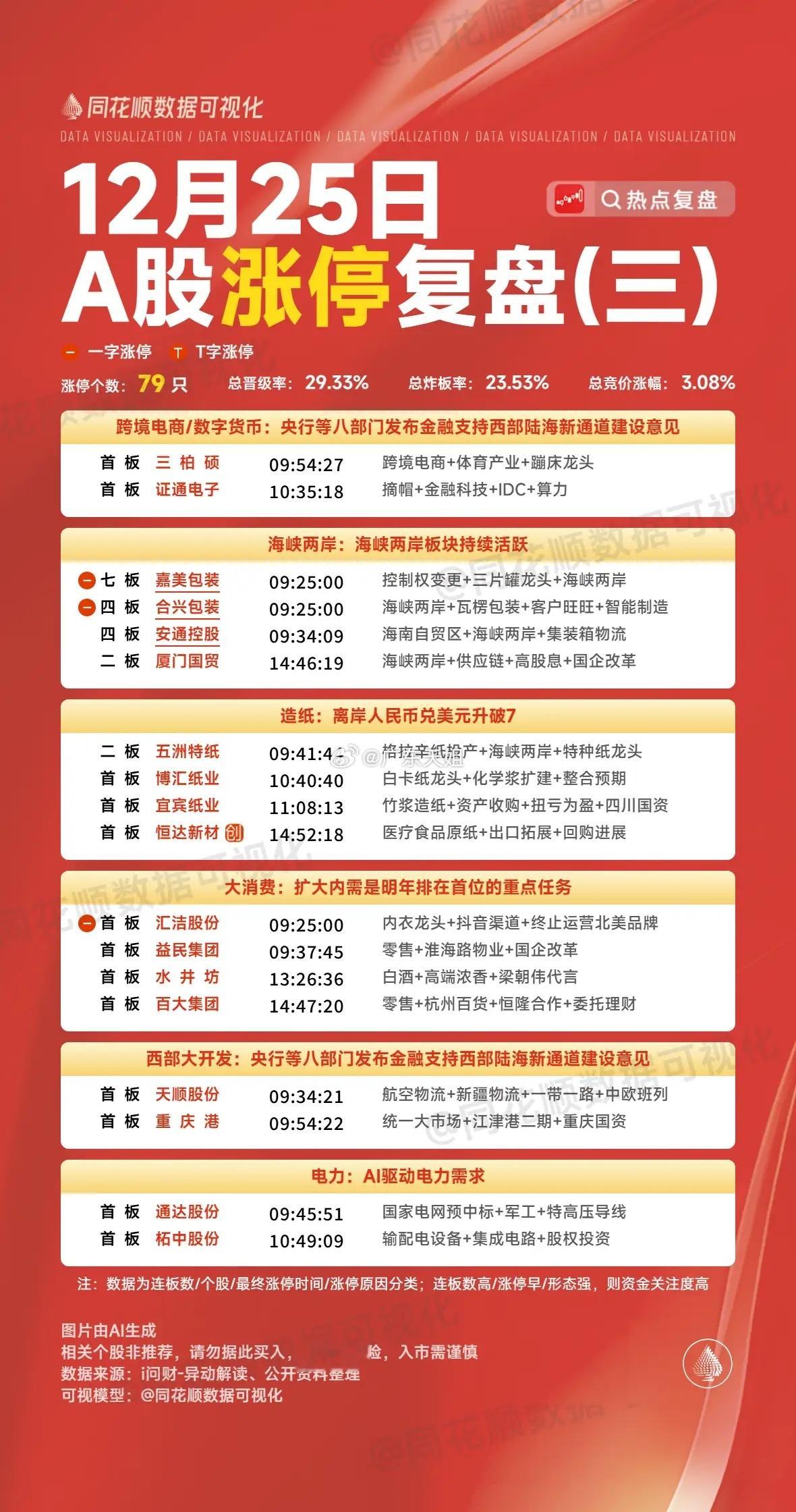 12月25日复盘:商业航天继续高潮,其余板块仅剩妖股持续发力!1、商业航天:神剑股份、再升科技早盘竞价九鼎大单一字板确认强势,神剑和再升两大龙头虽然都是涨停价开盘,但是资金明显有释放抛压的意思,所以在竞价都是明显分歧状态,可是开盘后整个商业航天方向走出了非常强势的表现,所以这两只个股都是很快出现强承接彻底封死涨停,封死后几乎没有任何抛压,走出了非常强势的缩量连板形态!神剑已经达到了6板高度,好消息是隔日就算晋级7板也不会触发严重异动,这对于它来说就是个不小的机会,再加上它算是商业航天方向绝对的龙头,隔日就算板块强分歧,它必定也是资金的首选,所以这只个股隔日继续晋级的概率是非常大的,但是毕竟隔日达到7板高度,再继续连板就必然触发严重异动,它毕竟不是胜通那种重组个股,可以不当回事,从近期再升、东百、百大、航发严控异动的表现看,资金对于这个还是很谨慎的,所以隔日神剑板上很可能会出现比较多的抢跑资金,它的接力反而不是非常合适了,毕竟商业航天近期的所有龙头高度最高的只有6板,神剑隔日挑战7板,就算成功了,之后的高度也有限,这也是这只个股隔日大概率会出现大抛压的原因所在,所以神剑一旦竞价走强一字反而要注意风险!相比于神剑,再升竞价开一字板表态就是要走二波了,从情绪上看,板块持续高潮的情况下,再升开盘后炸板后迅速出现承接回封就是非常强了,而且是明显走出了突破新高表现,但是这只个股毕竟连续两天拉升放量都不是很明显,隔日如果商业航天出现分歧,它会是一个明显放量的形态,就看神剑给不给力了,如果神剑开盘有资金引导强封,它应该也会跟上,这两只个股就是明显的相互促进关系!2、零售:百大集团、东百集团昨天百大尾盘竞价控严重异动非常精准,今天脱离异动后竞价出现大幅高开,但是整个零售方向表现并不佳,所以它开盘是有资金分歧抢跑的,好在东百出现跟随共振,之后零售方向也突然走强,益民强势上板带动情绪,所以百大早盘是有多次尝试封板的,但是它毕竟在高位,而零售也没有昨天商业航天的强度,所以它连续几次封板无果后出现明显回落,之后零售整体也是大幅回落,直到尾盘最后阶段才有资金强势回封,最终走出了一个高位放量涨停!百大今天的表现是非常不错的,虽然尾盘才去封板,但是从量能上看是非常不错的,几乎是卡在放量后去回封,这样的表现下隔日得预期就还可以,毕竟零售方向近期整体表现一般,隔日一旦商业航天出现分歧,它反而有很大的看点,所以对于百大来说,只要隔日板块不差,它不排除会走出弱转强开启二波的表现,毕竟东百断板后也是有过类似的趋势上行!相比于百大,东百今天就是有点虎头蛇尾了,开盘后跟随百大拉升走强,但是百大迟迟不封死涨停,东百完全没有资金去拉升,之后跟随百大炸板回落,百大回落到开盘价之下时,东百出现了明显的资金兑现,可是之后百大反转,东百反而很难跟随了,毕竟今天虽然有资金在一直持续维持股价,但是如果尾盘大幅上涨,隔日得抛压反而会更大,所以最终东百选择性的走出了回落的表现!盘后的龙虎榜买盘几乎都是量化席位,卖盘知春路一日游清仓,其余多为量化席位,小群选择了这个位置继续格局,东百这个榜单算是符合预期的,尾盘的下杀反而对于隔日得修复非常友好,毕竟零售整体有反弹需求,今天首板走出了3只涨停,这在近期是很少见的,而且连续两日高潮的商业航天隔日有分歧预期,那么零售或许会是部分资金的首选,隔日一旦板块资金回流,东百作为龙头是很可能再次有资金去持续做多的,毕竟近期市场这样的情况下已经多次出现!3、海南自贸区:海南发展发展竞价4个点高开的表现还是不错的,但是整个海南自贸区方向开盘就明显下杀,发展作为龙头在顶住分歧后是走出了逆板块的走势的,但是毕竟板块极差无比,它也是明显的冲高回落,尾盘回落到开盘位置支撑明显,并且很快再次拉升到分时均线以上,可惜板块继续起到了负反馈,最终尾盘勉强收涨近7个点!盘后的龙虎榜买盘出现了5个机构进场接力,卖盘成都系为首的游资清仓离场,值得一提的是深南东路近2个亿的筹码并没有离场,这样的表现让小胖想到了华菱这只个股,同样连续一字板在4板时深南东路强势接力,之后4进5也是板块不给力断板,龙虎榜也是类似今天发展的榜单,再加上海南自贸区持续回调,隔日或许有修复预期,所以对于发展来说,隔日或许依然会有冲高的表现,特别是近期活跃板块的人气龙头,只要走到了4板高度,之后很容易走出趋势表现,早期的华菱,近期的鹭燕如此、世宝亦是如此,所以隔日发展的表现还是非常值得关注的!今天复盘形式改了一下,实盘近期可能不另外发了,就以截图形式发在复盘,谢谢大家的理解!本文只限于分享和交流,不构成投资建议,股市有风险,投资需谨慎!