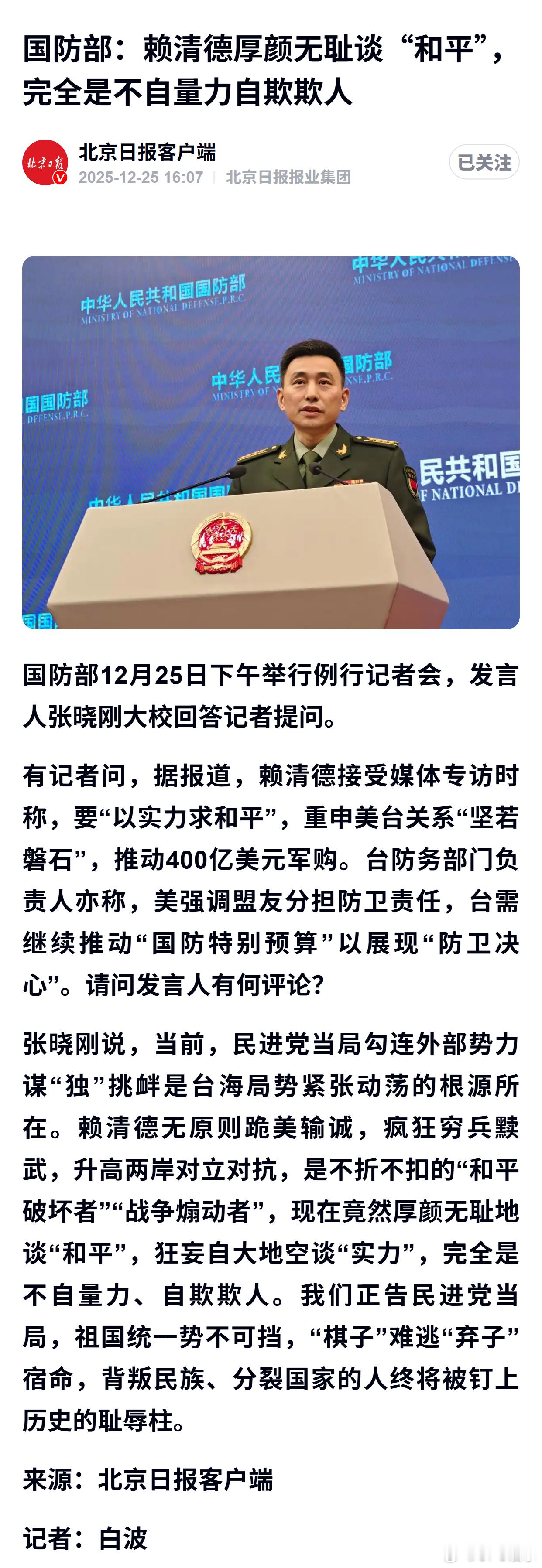 国防部:赖清德厚颜无耻谈“和平”,完全是不自量力自欺欺人