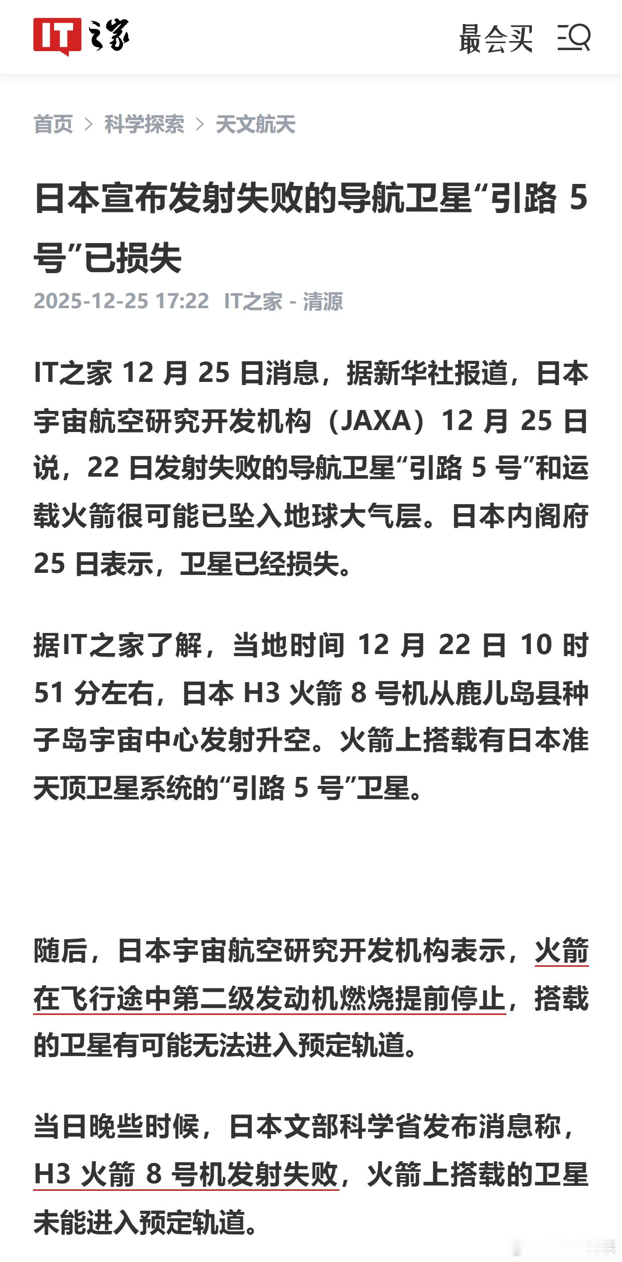 日本宣布发射失败的导航卫星“引路 5 号”已损失