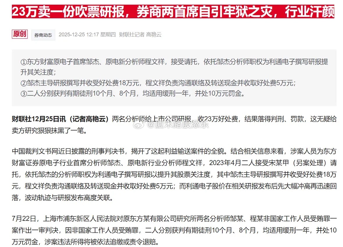 某券商两位首席分析师收23万元好处费,为上市公司写“吹票”研报抬升股价,最终被判刑罚款,属于典型的利益输送案例。这类违规研报败坏了券商研报的信誉,也是很多人不信任个股推荐研报的关键原因。分析师本职应是客观研判公司价值,带利益的研报会彻底丧失专业性。这里提醒股民:不管是券商研报还是各类市场荐股、吹票消息,都不能轻信,要提升自身辨别能力,避免被收割~!
