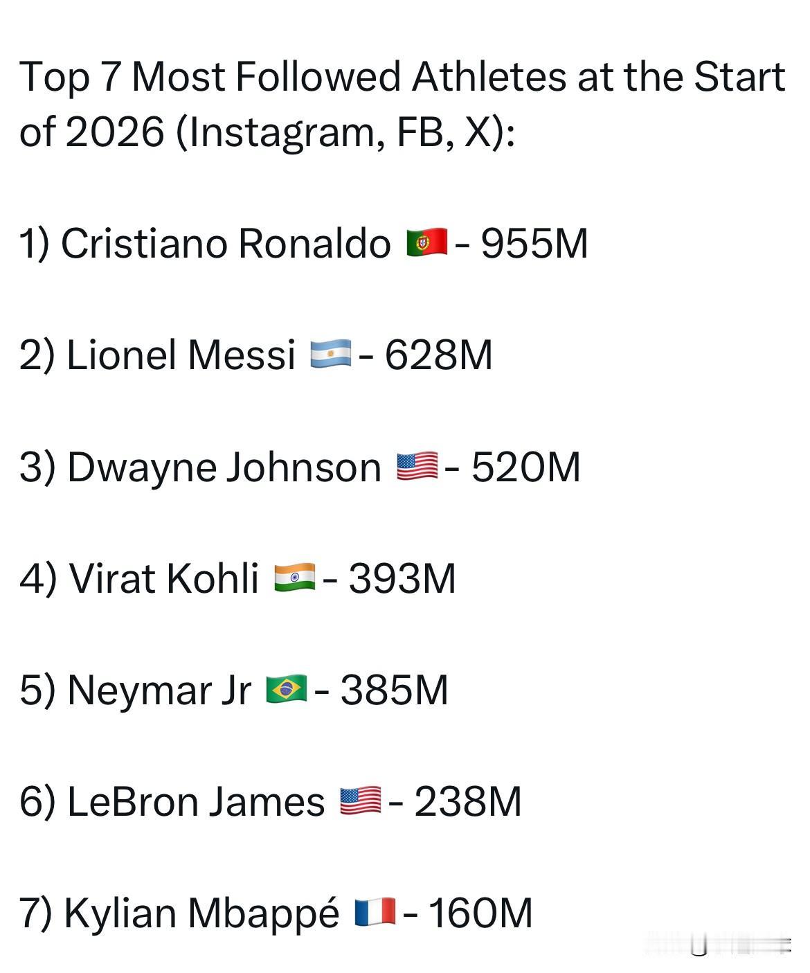 截至2025年12月,全球社交媒体粉丝数Top 7运动员(Instagram、脸书、X平台): 1)C罗纳尔多 🇵🇹 - 9.55亿 2)梅西 🇦🇷 - 6.28亿 3)道恩·强森 🇺🇸 - 5.20亿 4)维拉特·科利 🇮🇳 - 3.93亿 5)内马尔 🇧🇷 - 3.85亿 6)詹姆斯 🇺🇸 - 2.38亿 7)姆巴佩 🇫🇷 - 1.60亿 (注:数据统计包含Instagram、Facebook及X平台总粉丝量)
