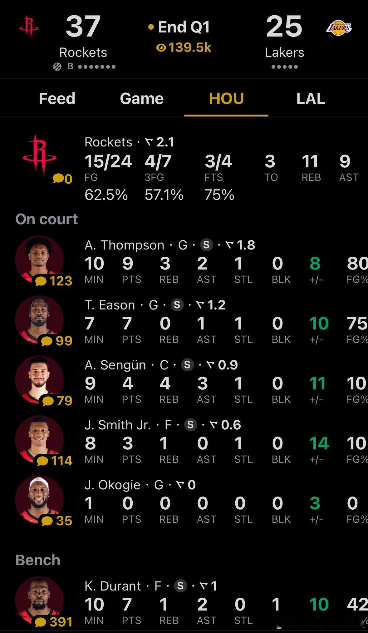 首节结束,火箭37比25领先湖人🚀随着DFS的复出,乌度卡首节就用了9人轮换?
