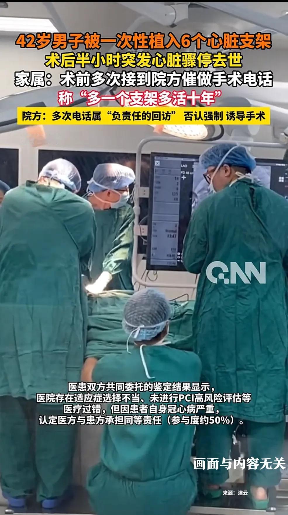 吉林舒兰,42岁男子植入6个支架后心脏骤停离世,家属称术前多次接到院方催做手术电话,院方:7次致电是术后回访,建议家属诉讼。 42岁正是上有老下有小的年纪,这位舒兰男子怎么也想不到,一场本以为能救命的心脏支架手术,会让自己永远离开家人。2025年7月26日他被推进舒兰市人民医院的手术室,一次性植入6个心脏支架,术后半小时就突发心脏骤停,虽经全力抢救,还是在8月3日没能挺过来。好好的一个人,进医院想治病,最后却阴阳两隔,换谁家里都接受不了。 家属回忆的细节更让人揪心,术前院里不止一次打电话催着做手术,还说“多一个支架多活十年”。这话听着像是给患者吃定心丸,可现在看来,更像是不顾患者实际情况的诱导。要知道心脏支架不是想装多少就装多少,得根据血管堵塞情况来,一次性植入6个,本身就存在极高的医疗风险,可这些风险,家属说术前根本没被清晰告知。 院方这边的说法却和家属完全对不上,说那7次电话不是术前催促,而是术后回访,还让家属走诉讼程序解决争议。可明眼人都能看出来,家属要的从来不是一句轻飘飘的回应,而是手术背后的真相:为什么要一次性植入6个支架?术前的风险评估到底做没做到位?所谓的“回访电话”,真的没有任何诱导手术的成分吗? 更关键的是,医患双方共同委托的鉴定结果已经给出结论,医院存在适应症选择不当、没做PCI高风险评估等医疗过错,和患者离世承担同等责任。后续吉林市医疗纠纷人民调解委员会提出医院担55%责任、赔偿约50万元的方案,家属却因为觉得没考虑精神损害和养老问题拒绝了,这场纠纷就这么僵住了。 其实心脏支架手术是治疗冠心病的常用手段,可医疗行为的核心永远是“对症施治”,不是支架装得越多越好。医院作为专业机构,本该把患者的生命安全放在第一位,严谨评估手术必要性和风险,而不是用“多活十年”这种模糊的话来引导患者。 这起事件也让我们看到,医患之间的信任一旦破裂,重建起来有多难。 各位读者你们怎么看?欢迎在评论区讨论。