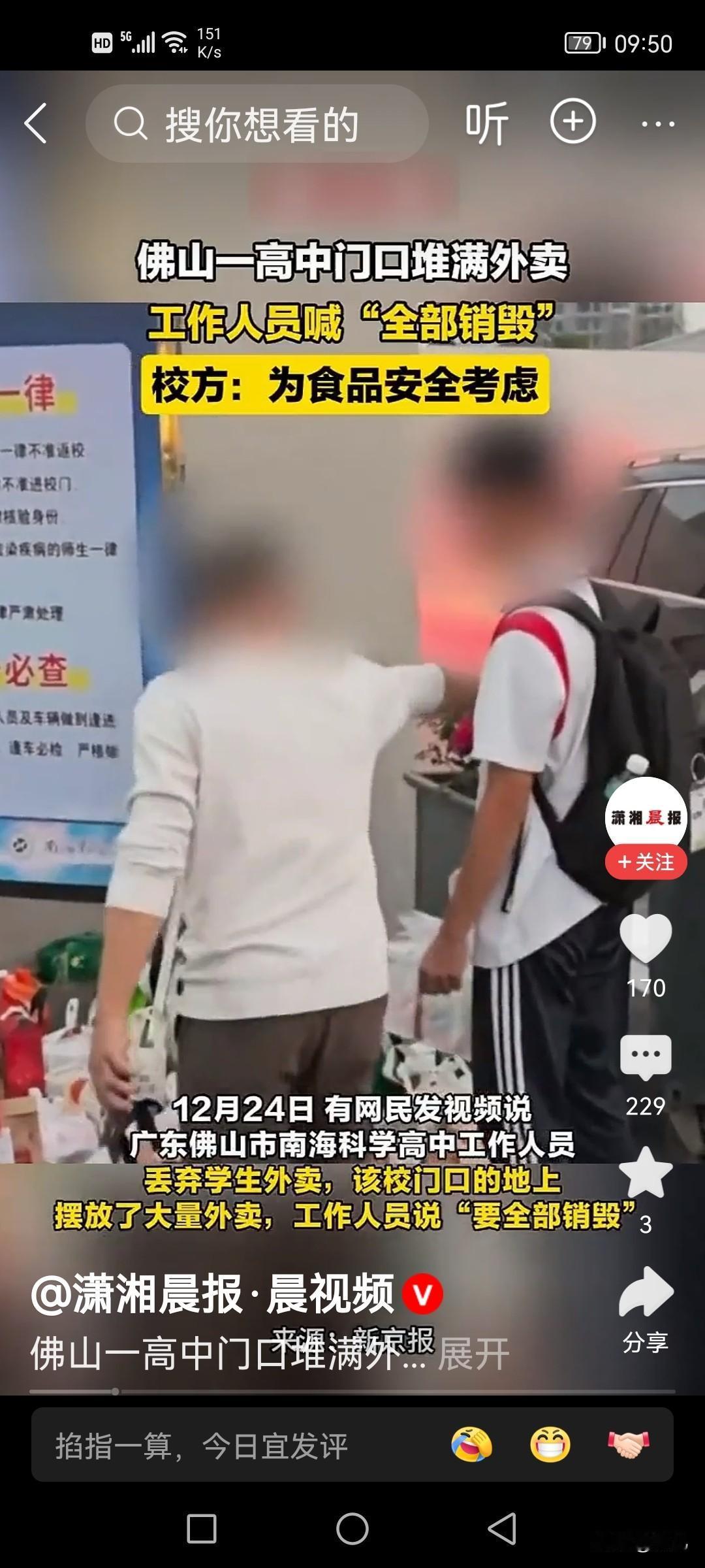 学生点外卖,有没有动了学校的“蛋糕”? 12月24日,广东佛山市南海科学高中的校门口,堆满了大量学生下单的外卖餐品,学校的工作人员不让学生领取,他们说这些外卖将被全部销毁。 网上报道学校食品不安全的多,报道学生吃外卖食品中毒的少,那学校为什么不让学生订外卖? 放学门口同学们聚集,秩序乱,然后吃完食品袋子有的扔垃圾桶外面,影响卫生。 攀比心理,有的在学校吃一碗面条子,有的外卖吃汉堡。 最主要是食堂做的饭都剩下了,扔了可惜,剩几次再吃怕吃出事来。也影响食堂的盈利。 有的学校屡禁不止,就会发生全部销毁。 有的高中家长说,孩子学习累,很多都是一个月回家一次,中间送一次饭,给孩子解解馋,为啥学校不让?学校的饭要好吃,家长还非要给孩子外卖餐品吗? 按说送一次饭无可厚非,就怕难管理,乱订外卖,控制不住,家长和外卖员围着到学校门口多了,不该看到的都看到了。 学校禁止学生点外卖不可能以食堂效益低了的理由,只能以一些别的借口制止,家长和学生也要遵守学校的规章制度。互相理解,互相包容吧!