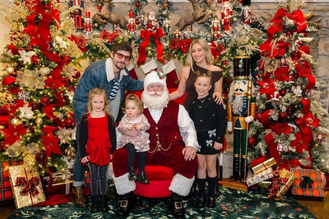 Hilary duff希拉里达芙和老公Matthew koma携三个闺女与圣诞老人的大合影,大儿子luca大概是跟爹过节去了