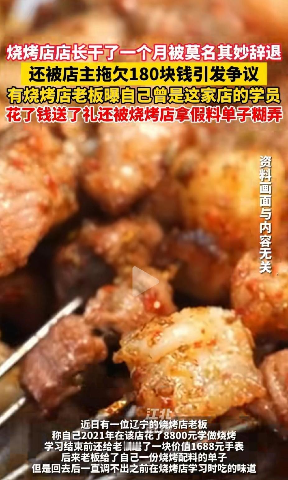 大雷烧烤店又暴雷。有人仰慕大雷烧烤前来拜师学艺,花了8800元学烧烤技术,学程结