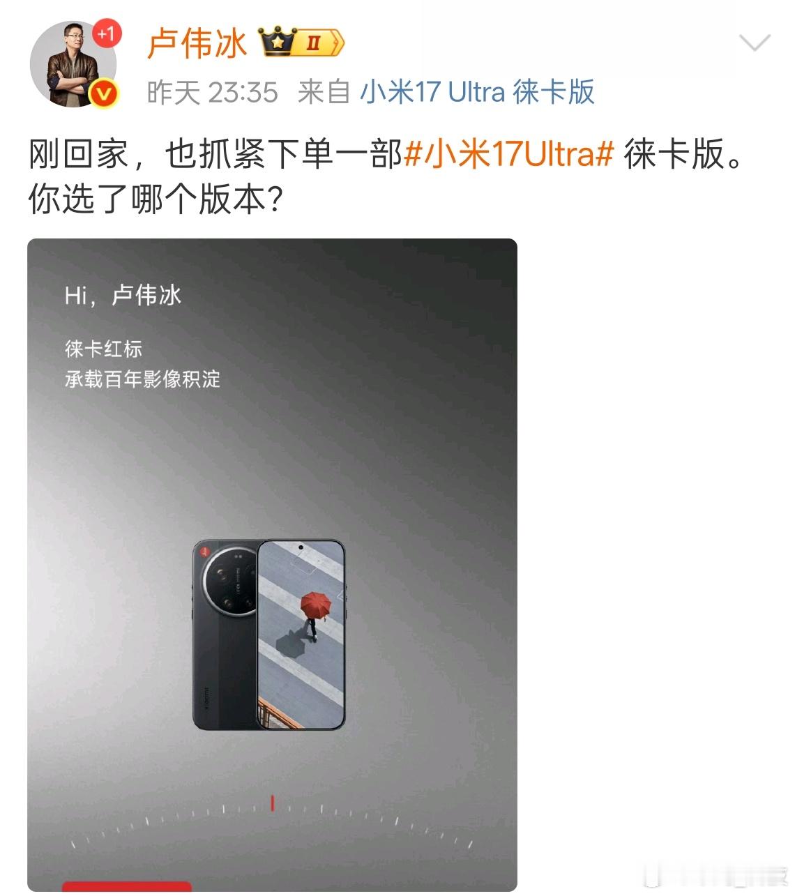 小米17ultra徕卡版价格卢总喊出小米17 Ultra徕卡版“799元”, 大家是不是激动了。随后又改口7999元,小米17 Ultra徕卡版真正的价格7999元更是凸显在了大屏上,气氛一下就起来了。卢伟冰发布会口误