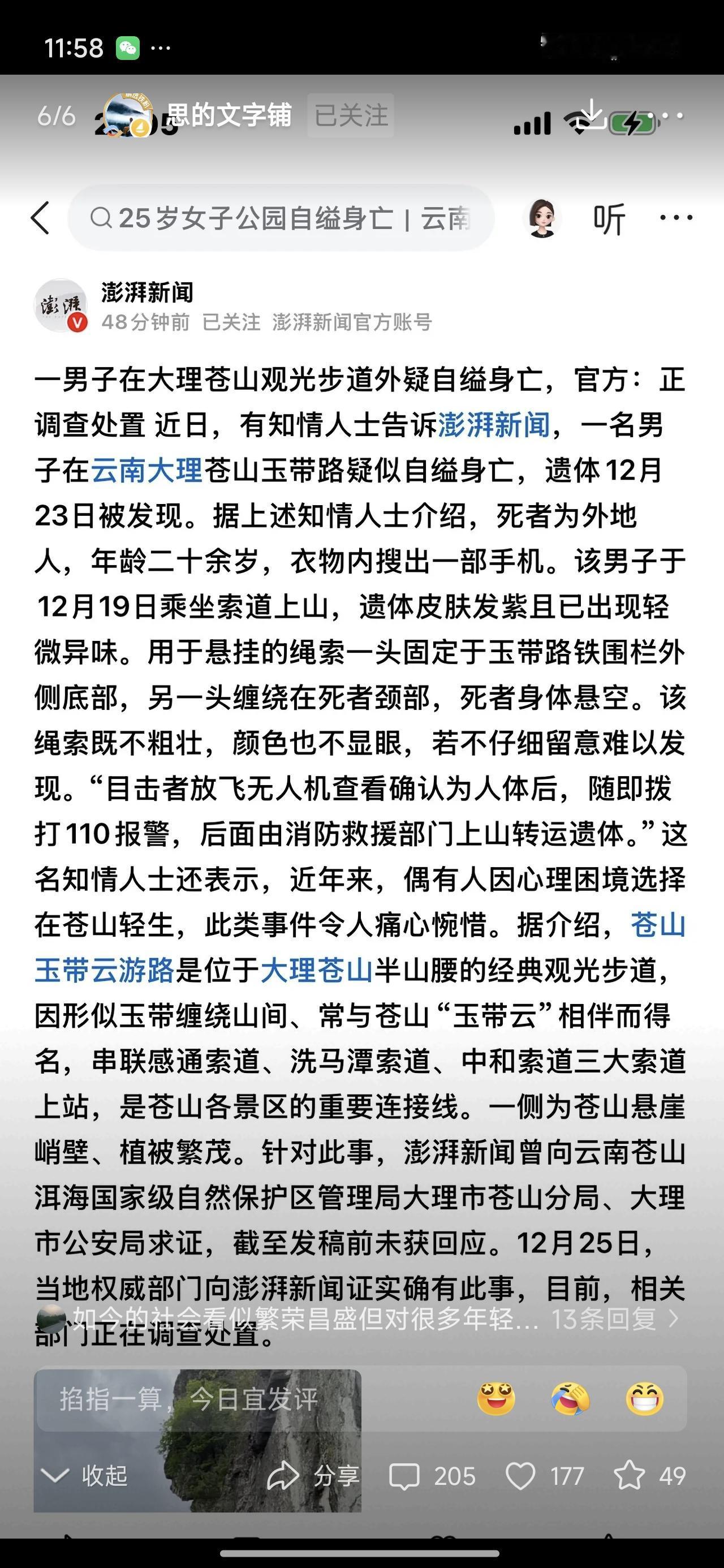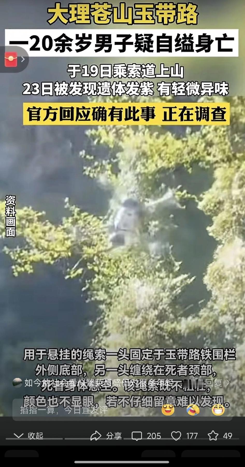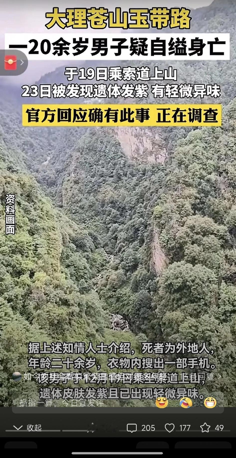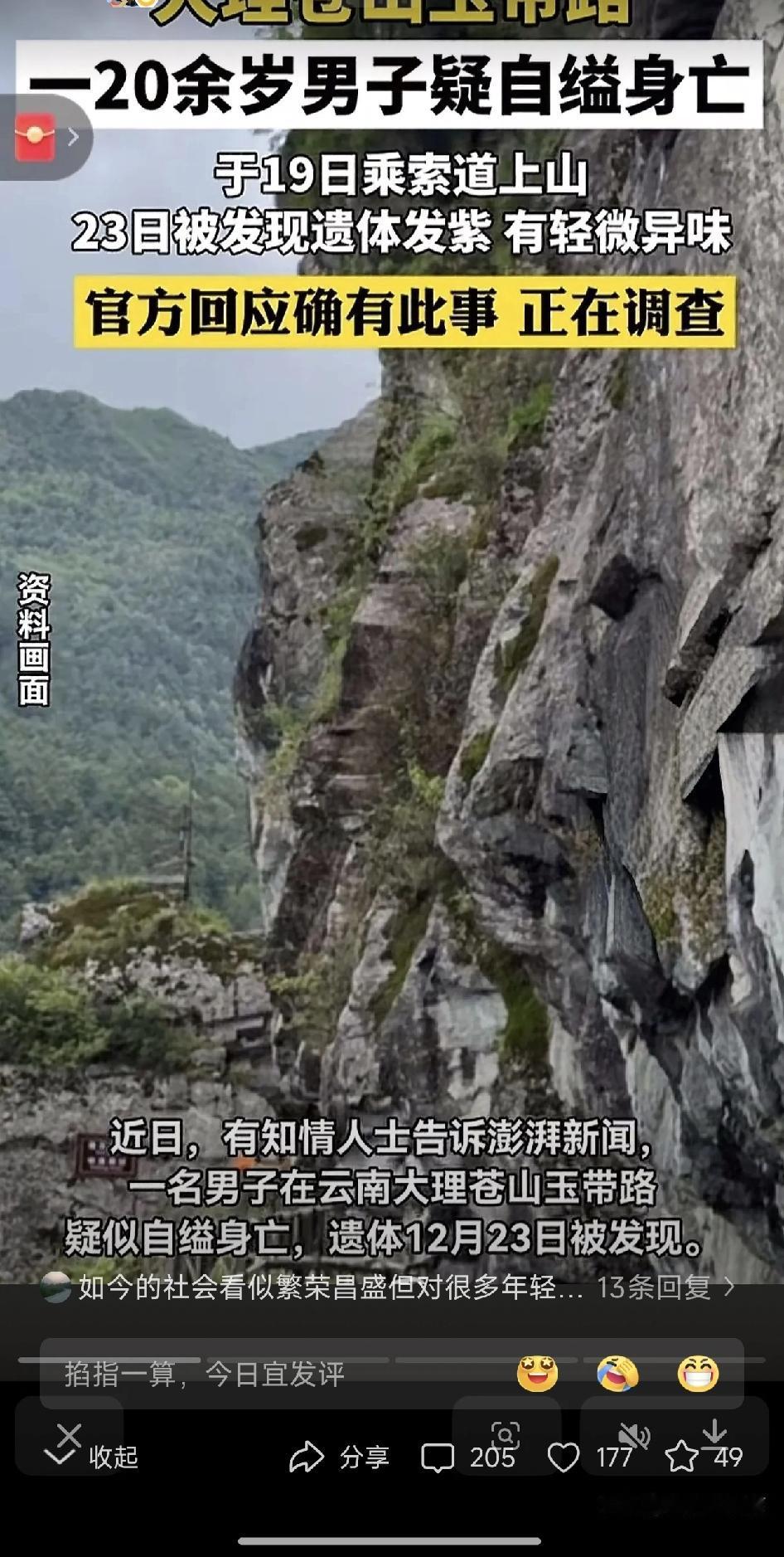 一男子跑到云南大理苍山玉带路去自杀,被无人机发现。才20多岁,外地人。 活着本身是挺不容易的,我刚才出去买菜,骑个小电动,忘记带手套了,冻的直痒痒。 男人么,不为情不为钱不为病,没有自杀的理由。才二十几岁,活到四十岁还有几次大的机会可以等。 人生是一段一段的。斩杀线,对于我们来说,只要不碰黄赌毒,就没有斩杀线一说。 过去了,前面是个天,过不去,就地躺一会儿。 你可以说买房子难,娶媳妇难,买车难,还房贷难。但如果就管自己一个人,简单的很。如果深陷泥潭难以自拔。就抽身出来,只养自己好了。