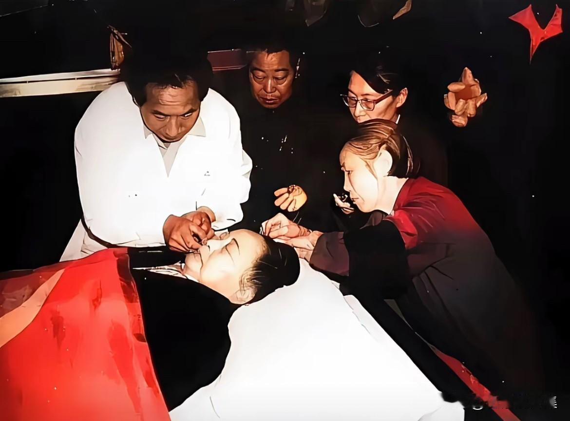 1981年5月29日,工作人员细致整理宋庆龄先生逝世后遗容的场景。她安详地躺在床上,身上覆盖着鲜红的党旗,面容平静祥和,宛如沉睡一般。宋庆龄生前曾多次提出入党申请,直到1981年5月15日,中共中央政治局决定接收她为中国共产党正式党员,5月16日,全国人大常委会授予她中华人民共和国名誉主席荣誉称号。在她逝世前13天,终于实现了加入中国共产党的夙愿,才得以党旗覆盖。