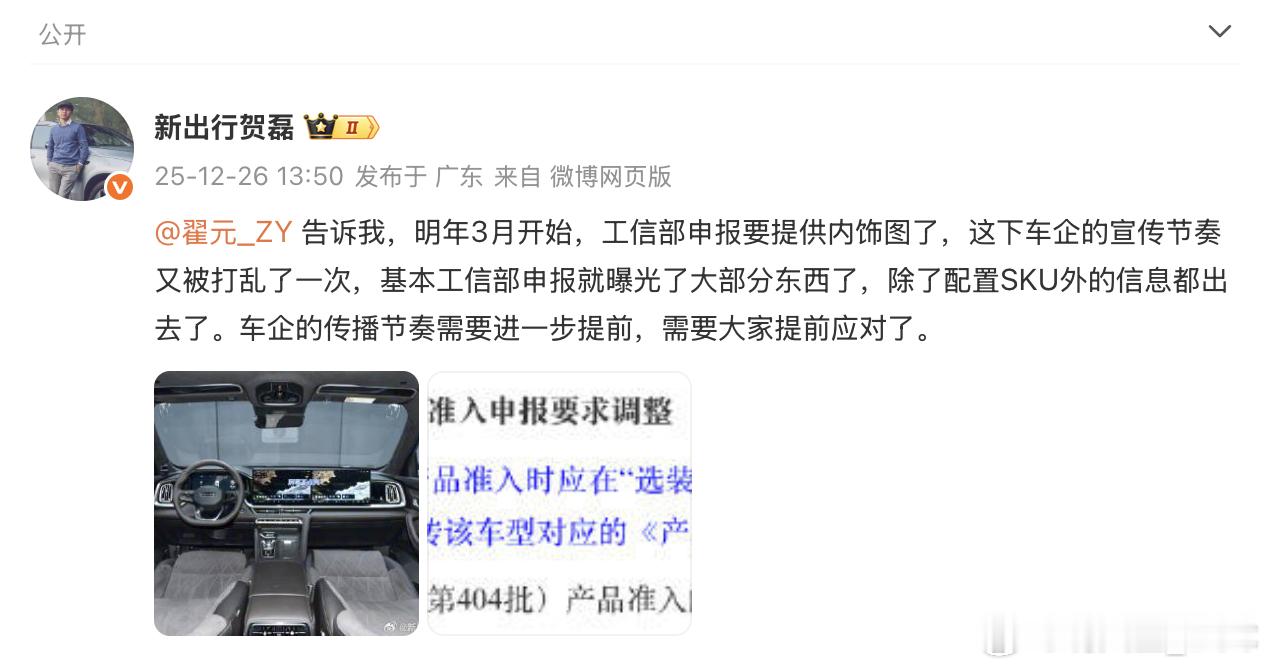根据老师消息,以后工信部公告,会同时公布「外观+内饰图」。从404批,也就是明年3月开始。公告图也要卷起来了