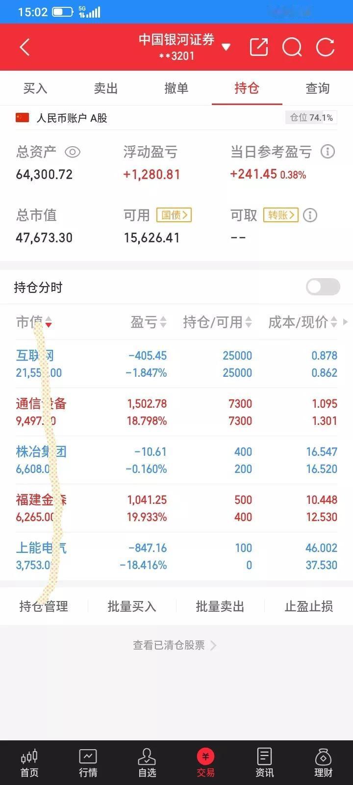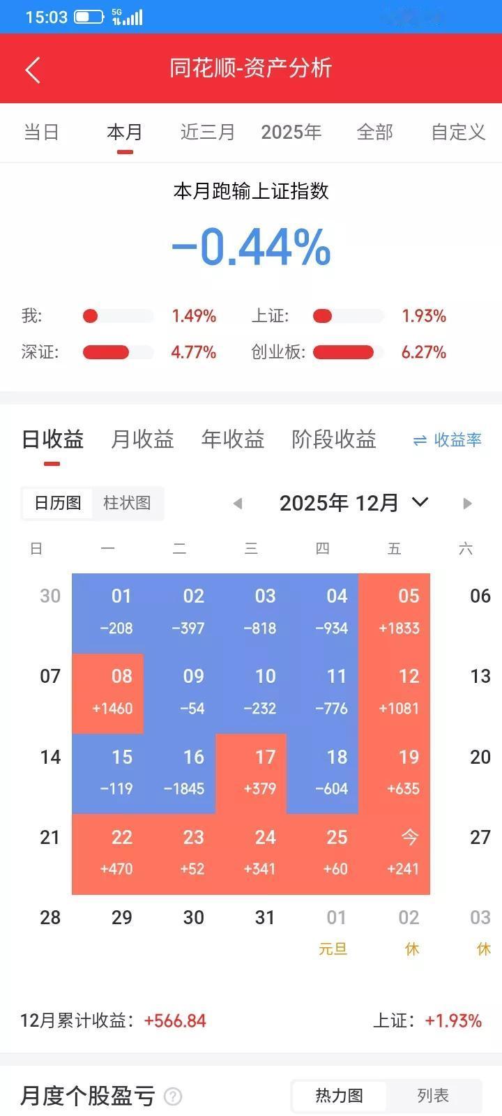 2025.12.26,今天上证指数继续强势上涨,但是突然大幅跳水,下午虽然又拉起来一点点,但是我的重仓的股票却止不住下跌了,收在当天最低价。 又是出人意料的一天,重仓的上能早上38.20大幅高开高走,让我后悔不已,于是回落的时候迅速以37.80追高买入100股,买入之后就不断上涨,最高冲到38.78元,差不多100块钱利润,但是还没有来得及高兴几分钟,第二次冲击38.78,没有冲上去,就下跌了,大盘跳水了,迅速跌了一块多,还幻想上涨,下午还真上涨了,但是最高冲到38.28又回落了,而且越跌越猛,收盘把全天买入的都套住了,赚100块钱到倒亏了30块钱,错了,还是乖乖认错吧,放弃上涨的幻想,收盘以37.53卖掉100股,做t失败,亏了29块钱。 今天金森低开低走,然后触底反弹,跳水的时候,以12.41买入100股,买入之后不断上涨,最高冲到12.71,但是收盘又回落了很多,收盘以12.53卖掉100股,做t成功,赚11块钱。 今天互联网etf反弹了一点点,收盘以0.862卖掉1000股,降低一点仓位。 昨天收盘止损了的株冶,又卖错了,今天高开高走,然后回落,卖错了也要修正错误,于是以16.16买入100股,下跌中以16.10又买入100股,这100股买在最低价了,然后就逐步反弹上涨,收盘赚几十块钱,但是上涨了可能还会继续上涨,不做t了,当补仓,多持有几天看一看。 今天总市值4.76万元,总资产6.43万元,今天最高赚500多,到收盘回落了很多,今天总体账户反弹回本241元。今天后悔死了,上能冲高舍不得卖,赚几百块到倒亏了几十块钱。