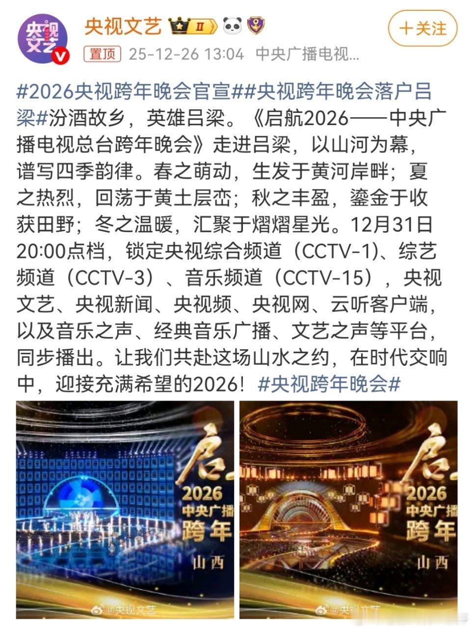 央视跨年晚会来到吕梁山河为幕,吕梁为台!央视跨年晚会正式官宣,走进吕梁。一起感受四季流转,从黄河岸畔的春到熠熠星光的冬,在黄土层峦间迎接崭新一年。一起共赴这场山水之约!央视跨年晚会