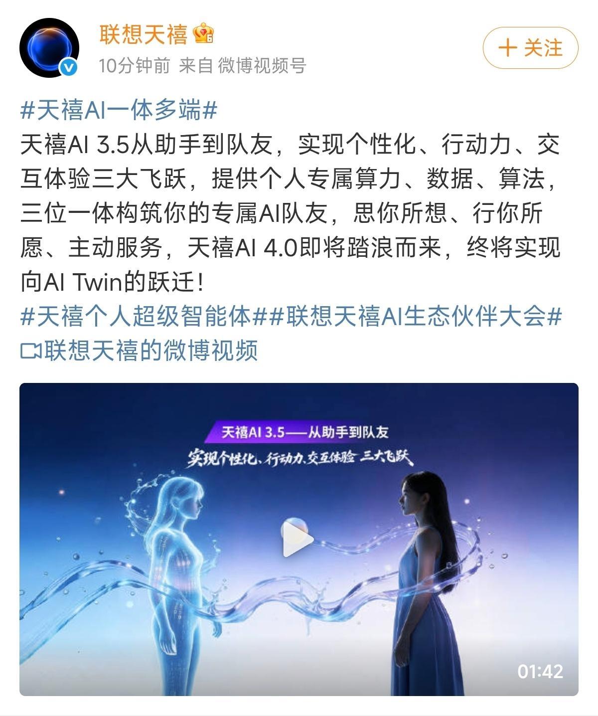 天禧AI从助手到队友今天是联想天禧AI生态伙伴大会,天禧AI已迭代至3.5版本,多端活跃占比超80%,天禧AI3.5实现个性化、行动力、交互体验三大飞跃,AI能力从助手到可以有闭环执行能力的队友,成为以"人"为中心的AI超级智能体,更是懂「场景切换」的智能伙伴,在工作时能迅速串联指令,搞定跨设备协作,生活里又能预判需求,安静打点好琐事。天禧AI一体多端 实现的不仅是设备联通,更是体验的连贯感。联想天禧AI可以说越来越强大。