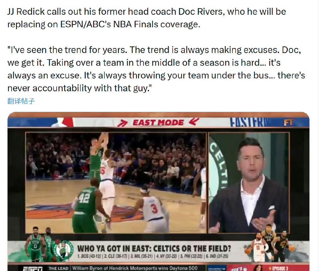 去年2月,还在ESPN担任嘉宾的雷迪克在节目中炮轰自己的前任主教练道格·里弗斯: “我多年来一直看到这种趋势,这种趋势就是总是找借口。老里,我们明白的,赛季中途接手一支球队很困难,总能有借口的,把自己的球队推出去当替罪羊,这种家伙永远不会承担责任。” 当时,里弗斯刚接手雄鹿队不久,在二月份10场比赛里3胜7负。