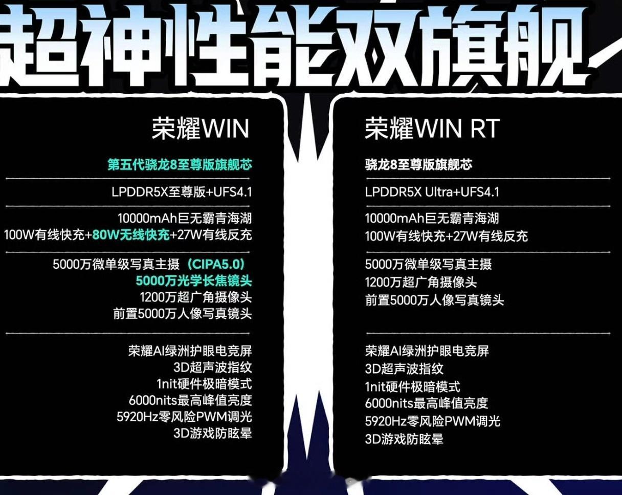 荣耀WIN系列价格可还行?WIN价格贵这么多,升级的很少,后面销量差异应该就能体现:WIN:3999起,五代骁龙8至尊,主摄多了CIPA5.0防抖,5000万长焦,80W无线充电,RT:2599起,骁龙8至尊都有:屏幕一样,10000电池,100W超级快充,5000万主摄+1200万广角+5000W前摄,3D超声波指纹