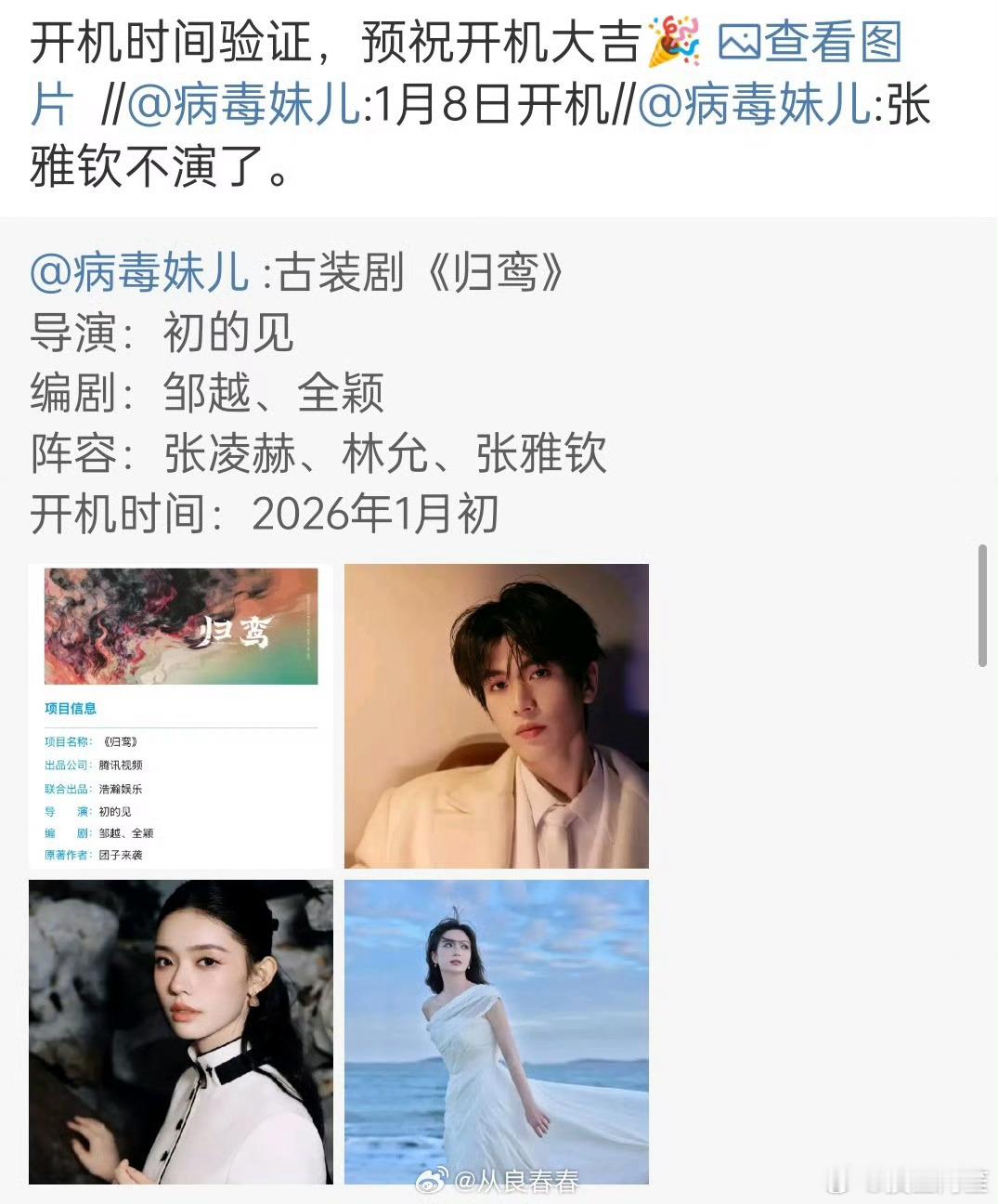 张凌赫、林允《归鸾》确认1月8号开机,将不进行开机应援活动。祝开机大吉