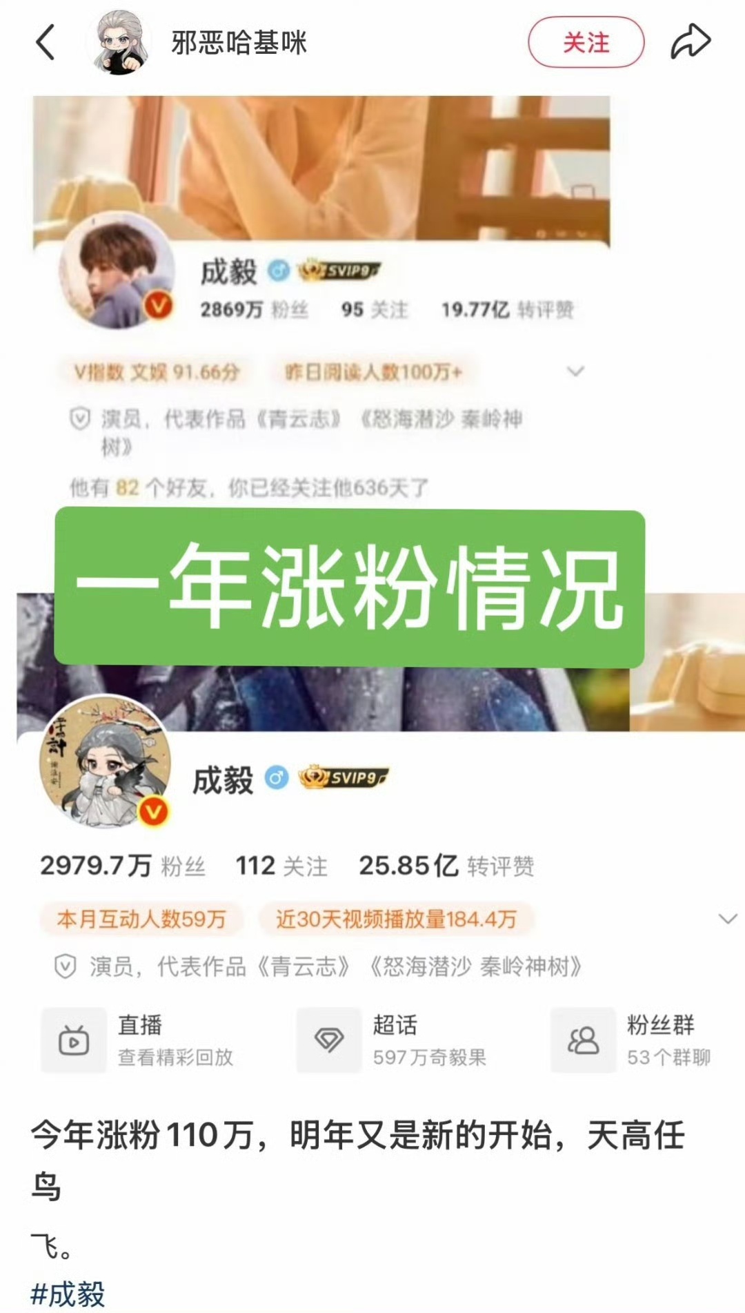 成毅成毅今年涨粉110万成毅今年涨了110万粉成毅今年涨了110万粉太牛了