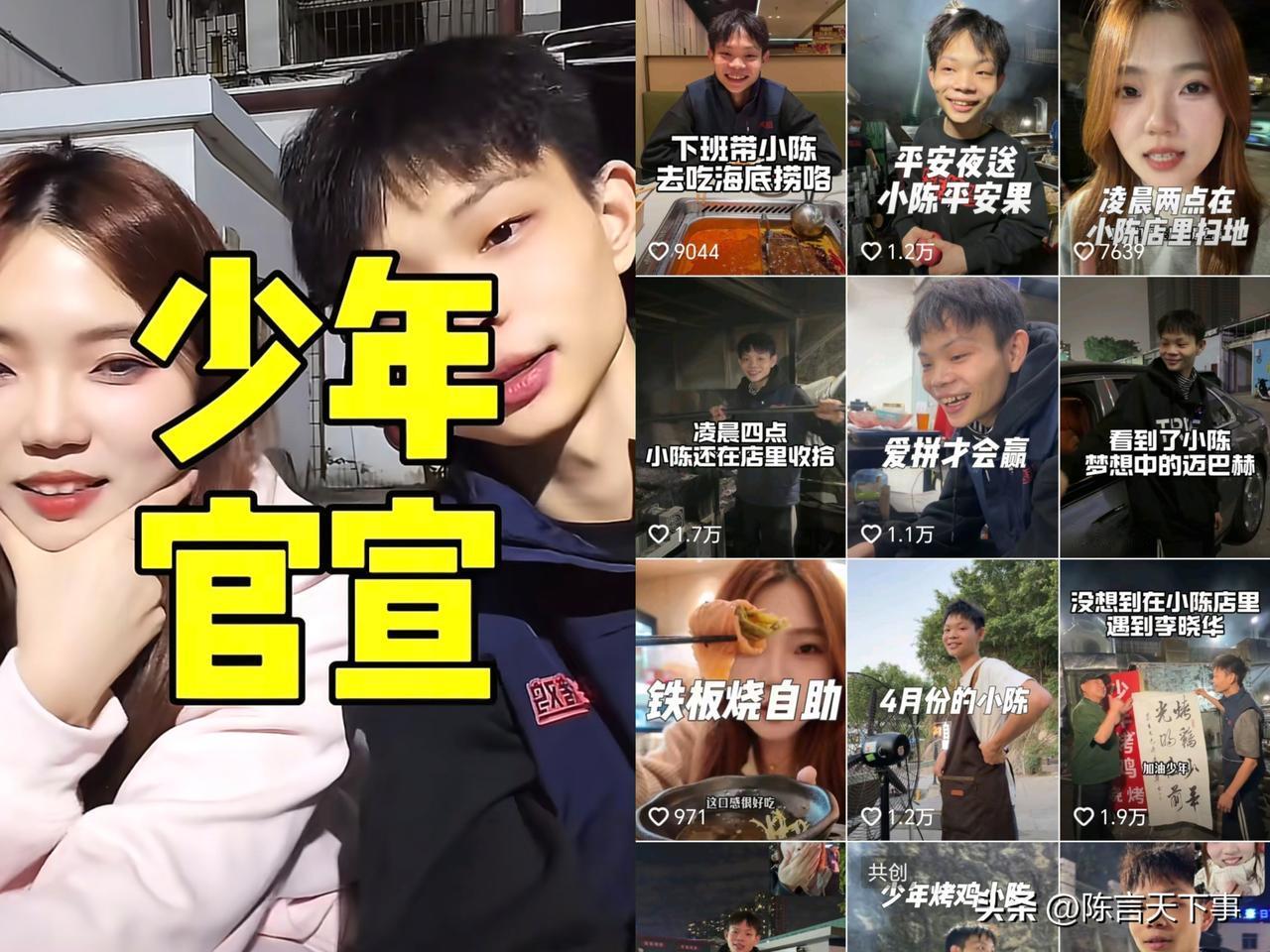 少年烤鸡小陈又被误会了! 他才16岁,怎么可能和dd谈恋爱,现在店里忙的晕头转脑的,他的心都投在怎么去服务好顾客,不让粉丝失望都来不及,哪有时间谈恋爱。 所谓的官宣,也就是和dd在直播时搞的一个小互动,就是开玩笑的啦! dd本身就是一名探店美食博主,小陈没火之前也被她探过店,说起来她也是小陈贵人之一。 现在小陈火了,她频繁去找小陈拍视频,一来是佩服这个16岁的少年励志,二来也有蹭热度的成分,小陈火了以后,她常驻店里直播也获得不少支持。 但小陈的热度总会有一天淡下去,就不知道到时候dd还会不会一如既往的支持小陈。