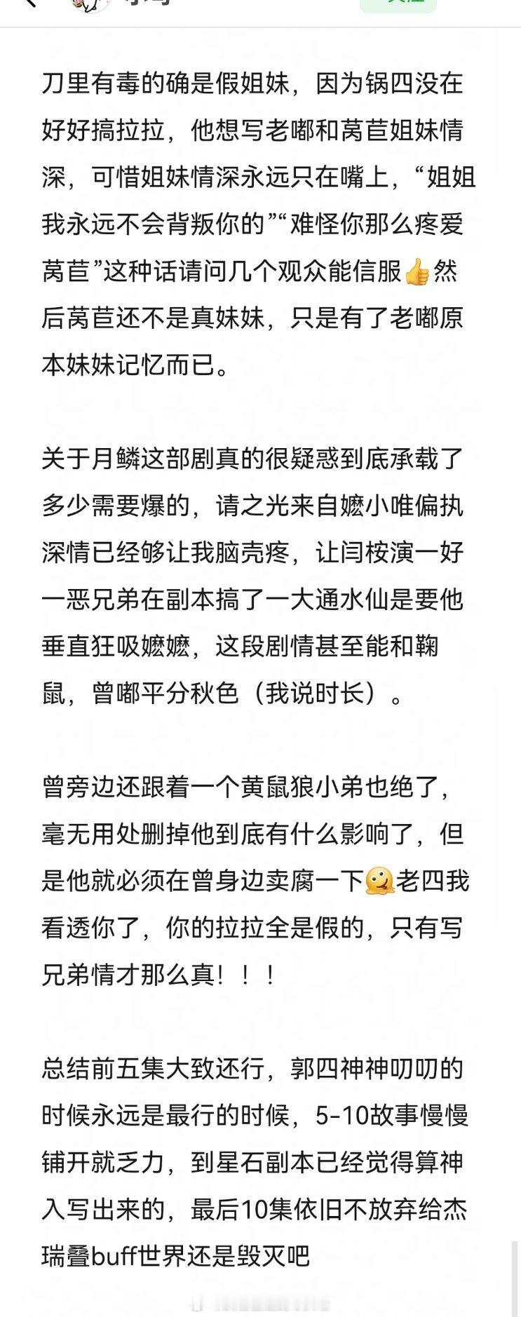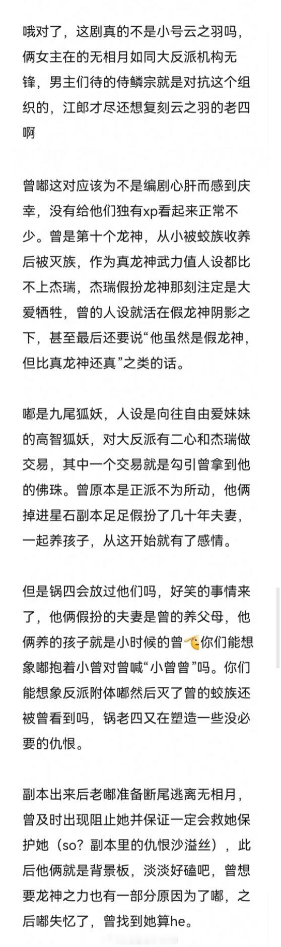 《月鳞绮纪》剧本repo,总结就是鞠婧祎田嘉瑞就是男女主配置,田嘉瑞人设各种buff叠满,类轩辕剑小雪x剑痴,女主爱上了男主的小号,反复确认大号和小号是不是一个人陈都灵曾舜晞很背景板,剧情人设都一般般