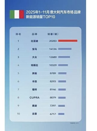 这可能连意大利女总理梅洛尼也没想到!中国车在意大利火了,比亚迪增535.3%! 11 月意大利新车销量达 124222 辆。电动车和混动大增,成主流动力路线,传统燃油车占则比下降明显。中国车企成为大赢家,总体销量突破1.5万台。 尤其是比亚迪最为值得关注。11月份,比亚迪在意大利乘用车市场的销量为3,526辆,同比增长535.3%,超过了多个传统汽车品牌。而1-11月份,比亚迪在意大利乘用车市场的累计销量为20,275辆,同比更是增长842.2%! 另一方面,除了意大利本土品牌外,其他来自意大利盟国的德国、法国、日本、美国等地的传统品牌则下滑至多超两成。