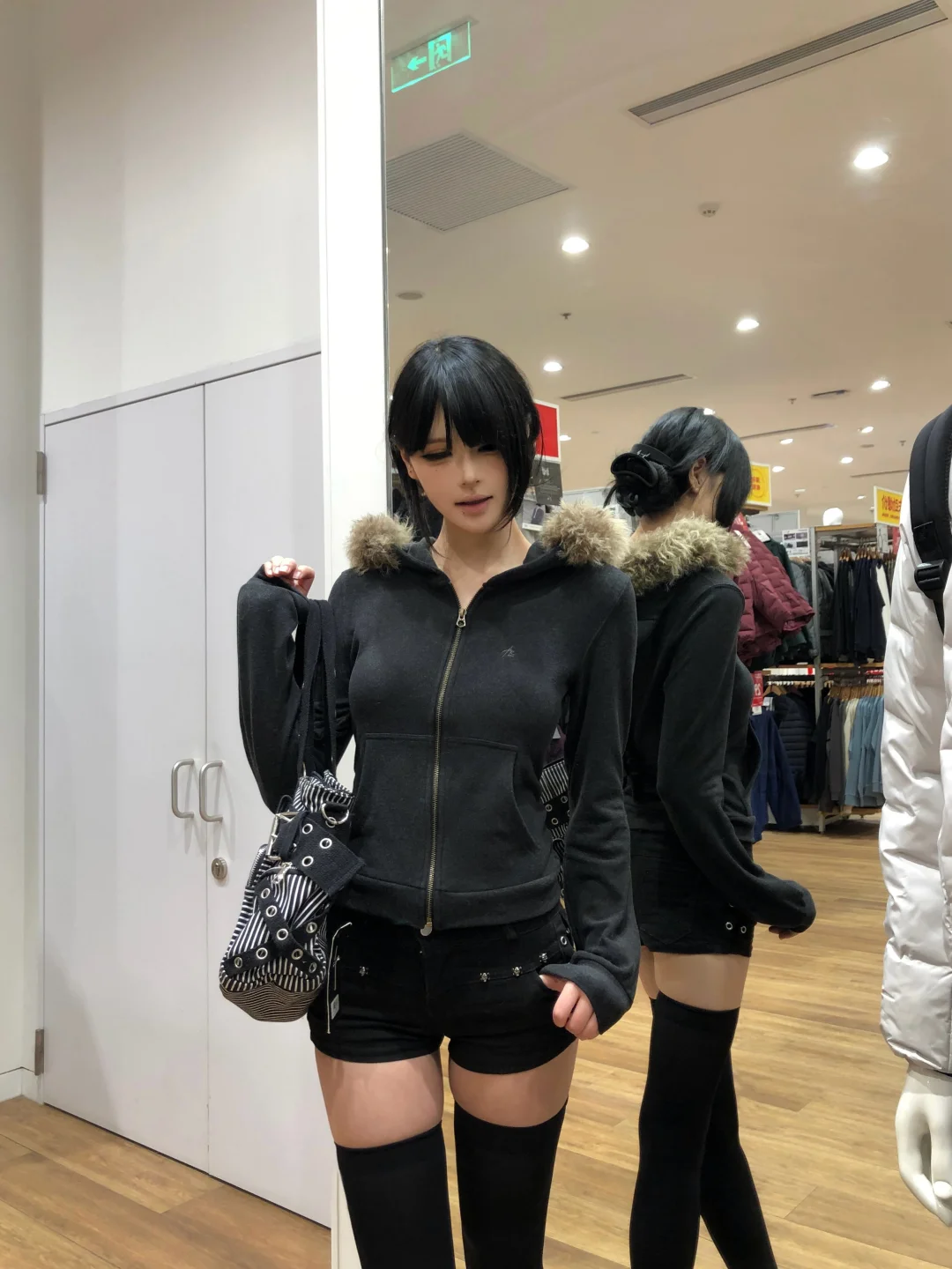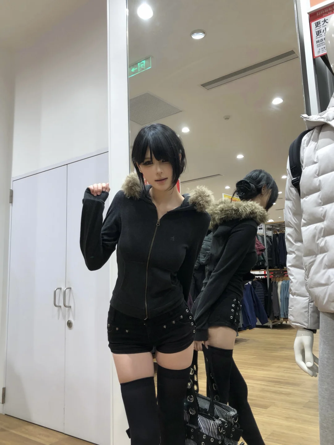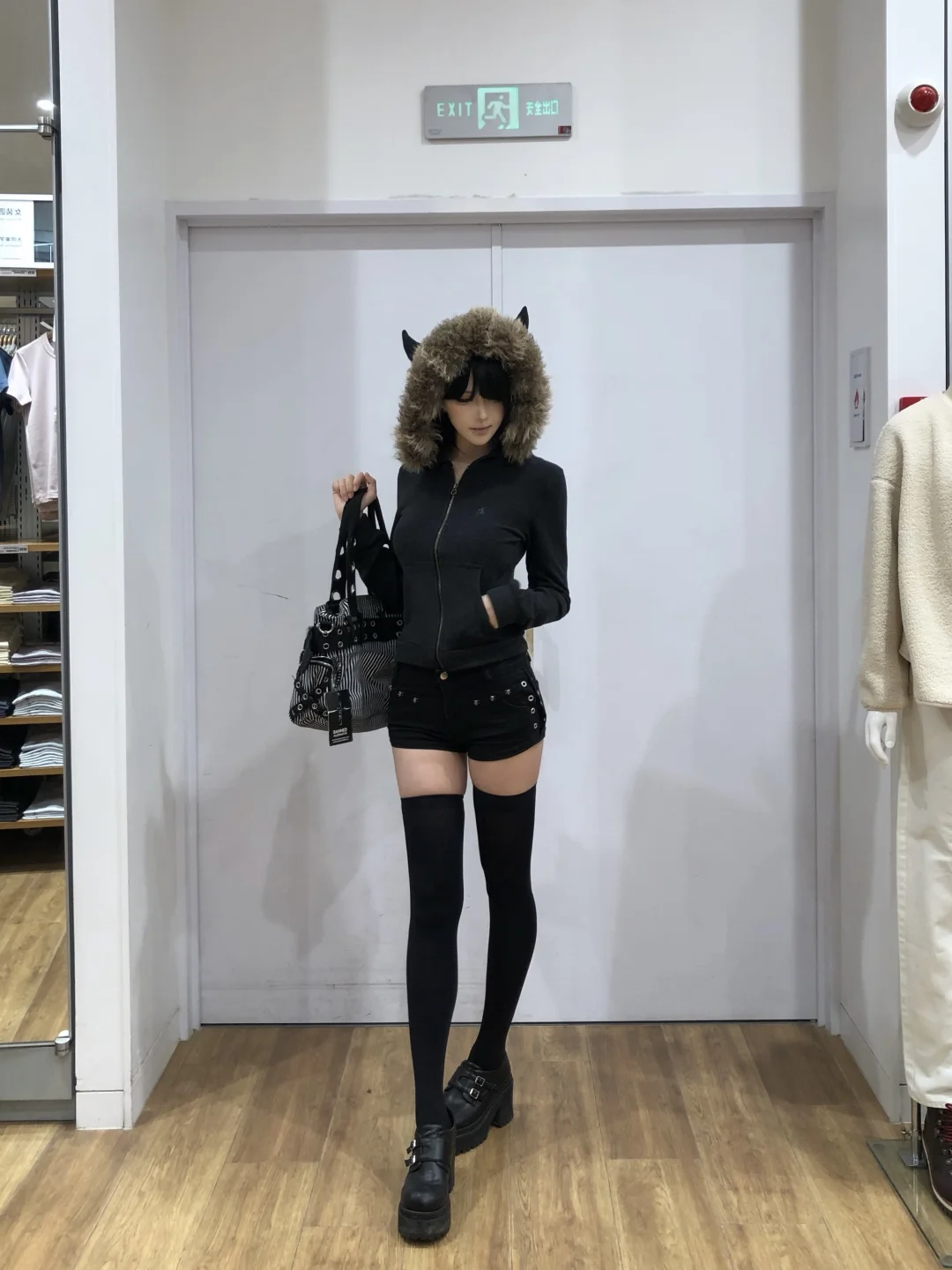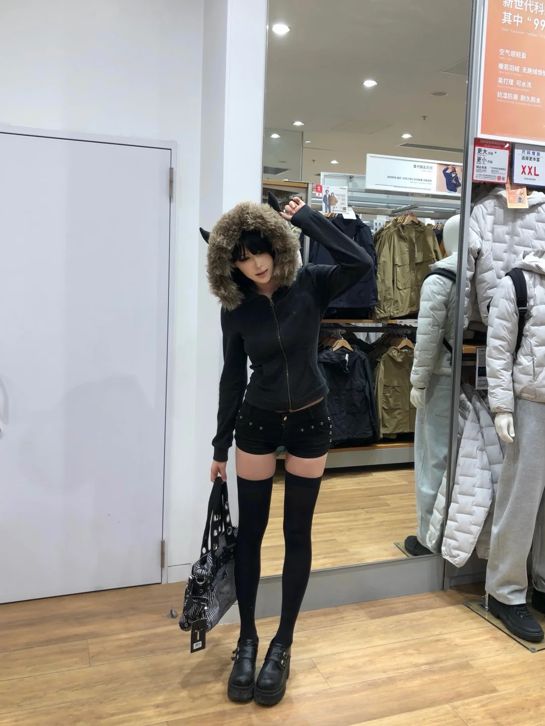 卡其毛领短羽绒+灰短裙,软乎乎的暖意裹着甜辣感,黑丝叠白堆堆袜+厚底鞋显高又元气