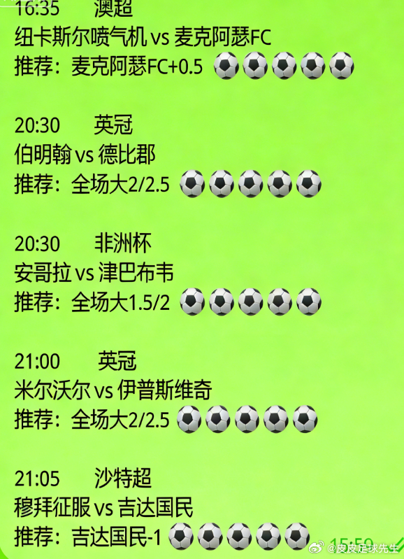 皮皮 5 场硬核稳单🔒 高命中率带你躺赢收米红单雷达持续预警!皮皮靠数据说话、用实力兜底,精选 5 场赛事无死角研判,跟上就是稳稳的幸福💰今日必跟赛事清单16:35 澳超|纽卡斯尔喷气机 vs 麦克阿瑟 FC推荐:麦克阿瑟 FC+0.5 ⚽️⚽️⚽️⚽️⚽️喷气机主场进攻效率走低,麦克阿瑟客场防守反击战术成熟,指数给到的让步空间合理,不败格局稳了!20:30 英冠|伯明翰 vs 德比郡推荐:全场大 2/2.5 ⚽️⚽️⚽️⚽️⚽️两队后防线漏洞百出,历史交手场均进球超 2.5 个,今晚注定是一场进球盛宴,大球直接冲!20:30 非洲杯|安哥拉 vs 津巴布韦推荐:全场大 1.5/2 ⚽️⚽️⚽️⚽️⚽️非洲杯向来不缺战意,双方都主打大开大合的踢法,小目标打底,进球数轻松超额完成!21:00 英冠|米尔沃尔 vs 伊普斯维奇推荐:全场大 2/2.5 ⚽️⚽️⚽️⚽️⚽️伊普斯维奇客场火力冠绝英冠,米尔沃尔主场偏爱压上进攻,攻防节奏拉满,进球机会管够!21:05 沙特超|穆拜征服 vs 吉达国民推荐:吉达国民 - 1 ⚽️⚽️⚽️⚽️⚽️吉达国民阵容豪华度拉满,近期联赛连胜势头正盛,客场碾压弱旅毫无悬念,指数稳稳拿下!皮皮从不搞花里胡哨!过往红单战绩可查,资金实力护航每一次推荐💥 跟上节奏,红单拿到手软!