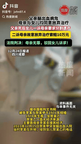 四川成都,一男子突发脑溢血病危,不料,母女俩却选择了放弃治疗,但没想到的是,女儿在分到一半遗产后,怒将母亲告上法院,指责母亲故意放弃对父亲的治疗,这侵犯了父亲的生命权,要求母亲赔偿10万元,最终法院这样判! 信息来源:热度新闻 话说2023年12月15日那天下午,老贺在家突然脑溢血,被直送进ICU。 医生当时都说得明白:脑干出血量太大,抢救成功率不到5%,就算捡回一命,也可能摊上植物人后半辈子,每天几千块的医药费也烧得干干净净。 李某当时人在外地工厂打工,听到消息赶紧想买最快的票回去。 可她没到医院,女儿贺某就跟在电话里急吼吼:“妈,爸这事儿花钱太坑,咱家没那么宽裕,医生也说不太能活,别让他再受罪了,你先决定!” 说到底,贺某自己没工作,家里还得她带孩子,手头连盒奶粉钱都紧张。 李某一边掉眼泪一边犹豫:要是拼命救,捡回来一命,恐怕要欠债压垮一家人? 就这样,母女俩一合计,当场就在同意书上签了字。 没想到,老贺走了没几个月,女儿拿着继承权第一顺序的招数先起诉,分那25万元存款和那套还在还贷的房子。 折腾一番,法院调解下来,母女各得12.5万。 大家以为差不多完事了,谁料贺某又来一手二次起诉:说李某当初故意不救夫家人,侵犯了生命权,硬是要母亲赔10万精神损失费。 这样的操作,简直刷新三观。 法律上,《民法典》1127条明文配偶和子女第一顺序继承人要均等分遗产,放弃治疗又只要符合医生告知、家属真实意思表示,根本谈不上违法侵权。 法院一看,李某真的是听医生诊断后自己决定的,也没冒名顶替签字的事,干脆把贺某的诉求全给驳回了。 很多网友看完都炸锅:啃老没脸了吧,还想坑亲妈? 更有姑娘说,真让人心寒,病房里还互相抱着哭,骨灰都没凉呢,就开始算账撕破脸。 其实,医药费高、希望渺茫,这种两难境地谁都不好受,但一旦闹上法庭,再多道理也修不回信任,父母把孩子养大到能独立生活,抚养义务就结束了。 成年子女该懂得的,是孝敬和赡养,不是“啃老”“背后捅刀”,这女儿的做法真让人寒心,父亲去世,母亲已经很难过了,她还这么过分起诉母亲,真是人心难测,这样的女儿不要也罢,为了钱财竟然把亲情都要斩断。