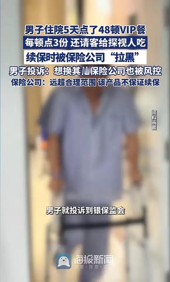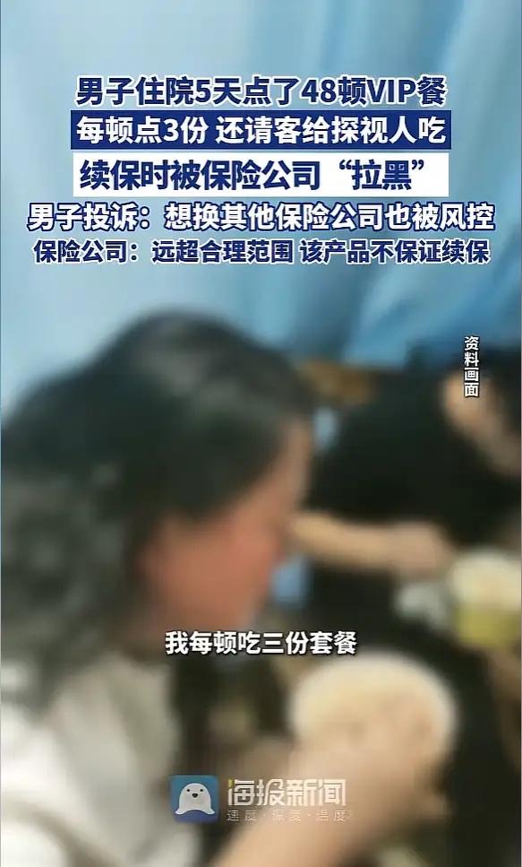“离了个大谱!”江苏南京,一男子住院期间,5天点了48顿VIP套餐,还要找保险公司全额报销,据悉,男子点餐不仅自己吃,还用来请客,远远超出合理范围,于是保险公司不仅拒绝给男子续保,还让他全家被“拉黑”。网友:还敢乱来吗? 住院五天,总共也就十来顿饭,这位男子却点出了48顿VIP套餐的账单,算下来平均一天接近十顿。这哪是住院养病,分明是到了豪华餐厅包场了。这些高价餐食不仅进了他自己的肚子,还成了他招待来院探视亲友的“人情”。 这种离谱操作背后,是一种“不花自己钱就不心疼”的心态。觉得反正是保险公司买单,能多报一点是一点。类似的情况在保险理赔中并不少见,比如有人只是轻微软组织挫伤,却赖在医院一百多天不肯出院;或者明明伤了三颗牙,非要连带着把旁边五颗也一起做了高级修复。 保险是保障意外带来的必要损失,保险公司在处理理赔时,对于各项费用是否“合理且必要”有着严格的审核标准。像这种明显超出正常需求的消费,被拒赔是板上钉钉的事。 保险公司之间通常会共享高风险客户信息,一个人因为这种不诚信行为被一家公司拒保,很可能意味着其他保险公司也会对其关上大门,这才导致了所谓的全家被“拉黑”。 想占便宜反而吃了大亏,不仅额外的餐费要自己承担,连未来的保障都丢了,任何不诚信的行为最终都会付出代价。 各位读者你们怎么看?欢迎在评论区讨论。