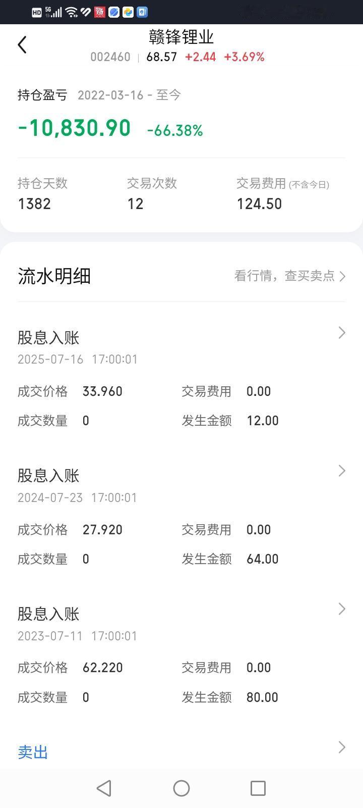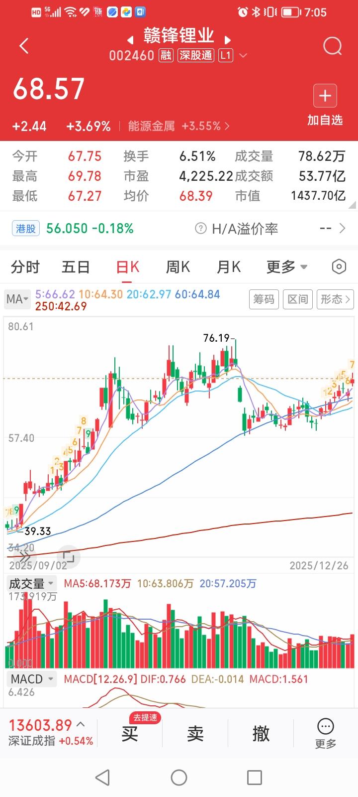 戆锋锂业,经过11月21日、11月22日连续两个向下跳空大跌洗盘后,没想到股价又沿着60日均线爬上来了,你说邪不邪? 赣锋锂业今天收盘继续上涨3.69% 。股价似有脱离60日均线加速上扬的迹象。 这种强周期的股票你越是不敢买,它越是涨给你看。咱目前仅持有戆锋锂业80股,要到201元才能解套。 戆锋锂业还会更疯吗?股价已经从20元左右涨到最高78元了,这种半山腰的股票咱真不敢加仓。