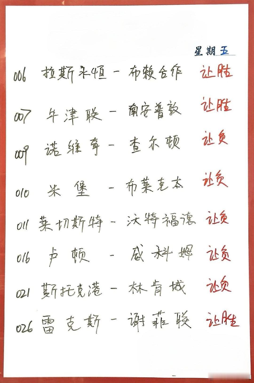12月26日001 纽卡斯尔联 VS 麦克阿瑟002 伯明翰 VS 德比郡 003 安哥拉 VS 津巴布韦004 米尔沃尔 VS 伊普斯维奇005 哈萨克斯坦VS 吉达国民006 拉斯永恒 VS 布赖代合作007 牛津联 VS 南安普顿008 西布罗姆维奇 VS 布里斯托城009 诺维奇 VS 查尔顿010 米德尔斯堡VS 布莱克本011 莱斯VS 沃特福德012 斯托克城 VS 普雷斯顿013 考文垂VS 斯旺西014 朴茨茅斯 VS 女王巡游015 哈德斯菲尔德 VS 维尔