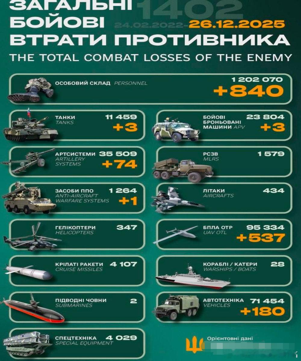 乌俄战争日报第1402天12月25日,乌空军“风暴阴影”巡航导弹袭击罗斯托夫州的俄新沙赫京斯基炼油厂,袭击引发猛烈爆炸和大火。当天,乌远程无人机袭击克拉斯诺达尔的捷姆留克海港,港内2座油气储罐、1条管道、2艘船只同时起火燃烧,过火面积达2000平方米,至今仍在燃烧。此外,乌还袭击了奥伦堡天然气加工厂的净化原料气、去除硫化氢和二氧化碳的3U-70装置管道栈桥,现场燃起大火。同时,附近迈科普市的俄军用机场也遭到袭击。乌俄战争进入第1402天,乌克兰总参谋部发布战报:过去24小时乌俄双方交战113次,其中21次在胡利亚伊波列(20次在苏梅)、16次在托列茨克、7次在莱曼、36次在波克罗夫斯克、13次在南顿涅茨克区域。毙伤俄840名。俄军累计损失1202070人。摧毁俄3辆坦克、3辆装甲车、74门火炮、1套防空系统、537架大型无人机、180辆军车。