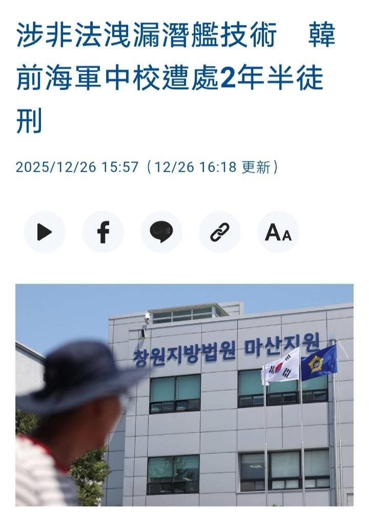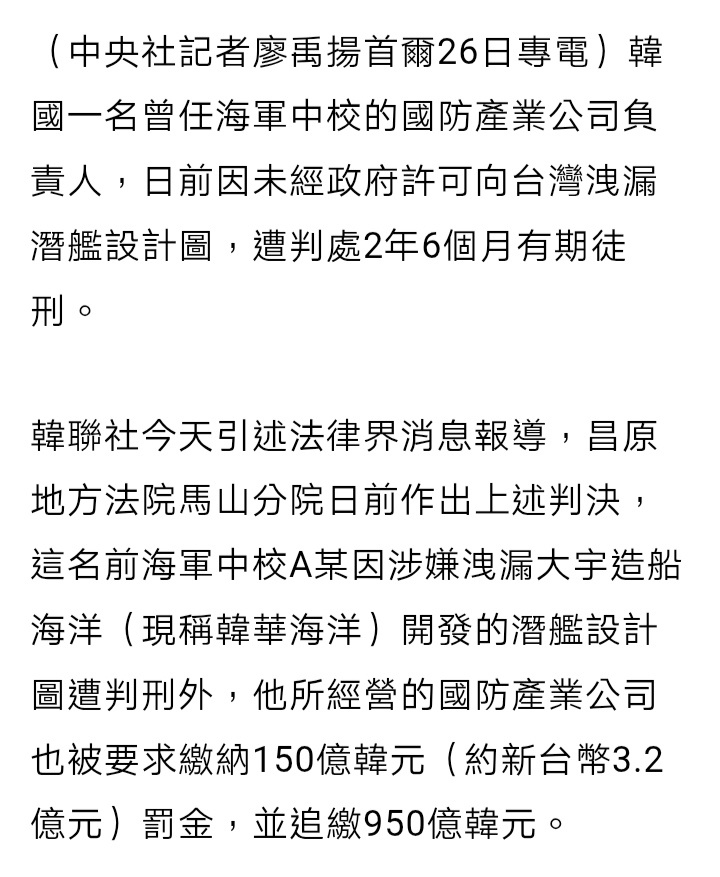 台媒还有脸报道:韩国前海军中校A某涉嫌在2019年到2020年间未经韩国政府许可向台湾泄漏潜艇鱼雷发射管设计图,遭判处2年6个月有期徒刑。