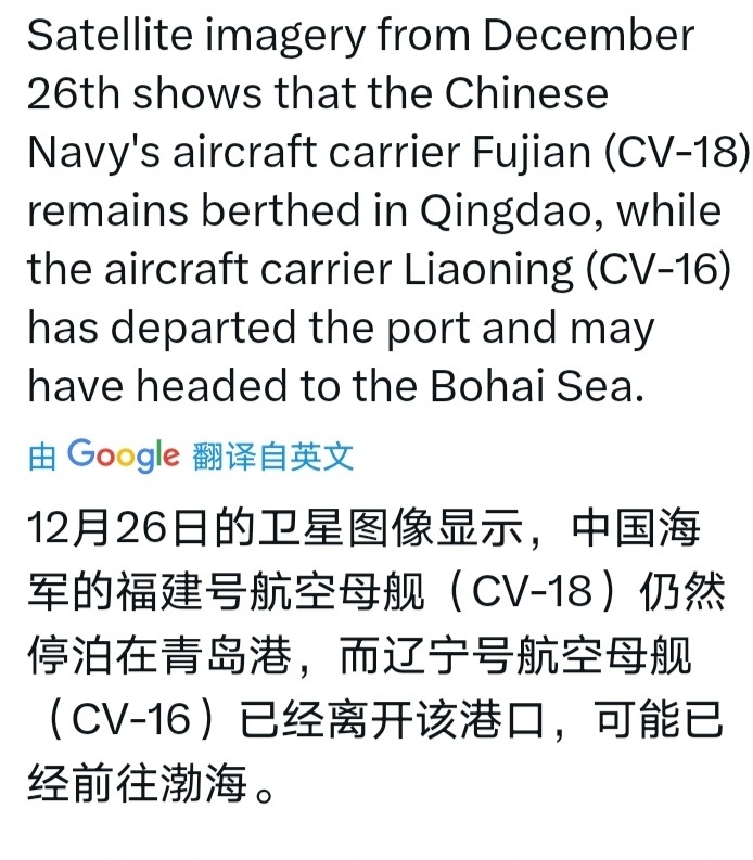 外网网友盯得真紧啊。卫星图片显示:12月26日,福建舰仍然停泊在青岛港,而辽宁舰已经离开该港口,可能已经前往渤海。