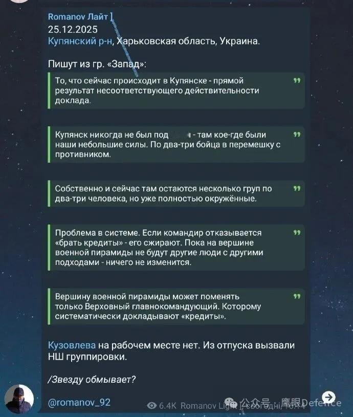 烽火问鼎计划 原本我还对谢尔盖·库佐夫列夫将军(俄军西部军区司令)隐隐有些同情,觉得他可能是为了配合宣传战需要才向克宫报告已“解放”库皮扬斯克,但现在库皮扬斯克战局糜烂至此,我已经完全可以理解克宫的愤怒和杀心了,之前不管是不是库佐夫列夫将军的错,现在都是他的错了,不是他的错,难道是克宫的错?克宫从来不会犯错的。包括库佐夫列夫将军和总参谋长格拉西莫夫大将在内,俄罗斯方面至少三次宣称已“解放”库皮扬斯克,普京更是在稍早前的“年终盘点”上嘲讽泽连斯基没敢进入库皮扬斯克城区,是“作秀”,现在,俄乌双方(不包括俄罗斯官方)都已证实,乌军基本已控制库皮扬斯克城区,俄军控制线被击退到库皮扬斯克北部和东部郊区。乌军联合部队发言人维克托·特列古博夫表示,俄军目前已失去维持阵地的能力,库皮扬斯克城区不再监听到有俄军的无线电通讯,现在还有大约50名俄军藏身下水道,"他们正在投降,我们甚至看到了外籍人员被俘,其补给实际上仅限于无人机运输,这种后勤体系难以支持长期固守。"尚未看到克里姆林宫或俄罗斯国防部回应乌军关于已解放库皮扬斯克的消息,但早在乌军官宣之前,包括“Rybar”和“罗曼诺夫”在内,多位知名俄罗斯军事博主就已通过发布战况图等形式承认库皮扬斯克已被乌军控制,并表达了对克里姆林宫和俄军撒谎的不满,指责他们故意发布假消息,强调俄军从未真正控制过库皮扬斯克,只不过是派出步兵小组渗透到乌军防线后方搞插旗行动,嘲讽俄军将领“城市丢了,但至少勋章已经发出去了。”一些在库皮扬斯克前线作战的俄军也发视频表达不满,没有直接指责克宫,而是怀疑俄军最高领导层没有向克宫汇报前线的真实情况,用虚假战绩来支撑早已失灵的指挥系统。“战争研究所”(ISW)注意到了俄罗斯军事博主们的强烈不满,这些不满和指责进一步揭露了克里姆林宫正在进行的认知战,克宫主导的认知战试图将乌克兰的防御描绘成濒临崩溃,并将俄军在战场上的胜利描绘成不可避免,但这种宣传与战场上的实际情况并不一致。俄罗斯军事博主们承认,在库皮扬斯克的失败表明俄军并没有足够的人力或资源迅速拿下一座中心城市,而在整个战场上,俄军已无力维持克宫希望的多方向进攻,如果要继续维持进攻,就有必要将全面进攻转为重点进攻,甚至需要在某些方向采取防御,以便将有限的人力和资源抽调到进攻方向,而正是因为这种窘迫,克宫才希望迫使乌克兰交出尚未被俄军占领的顿巴斯筑垒地域,战场上很难甚至根本就拿不下这里,克宫希望通过政治欺诈来达到这个目的。