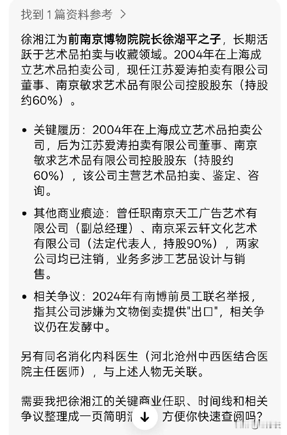 父亲当博物馆的馆长,儿子开拍卖行,本以为如此的事情不会发生,但是想不到这样的事情真的发生了。南京博物馆前馆长徐湖平,他的长子徐湘江长期活跃于艺术品拍卖和收藏领域,并且还开有了拍卖行,让人不得不怀疑二者有何关联,希望二者没有任何的关联,更没有任何的利益输送,否则会寒了捐赠人的心。父子二人只是纯粹对艺术品的喜爱,仅此而已。