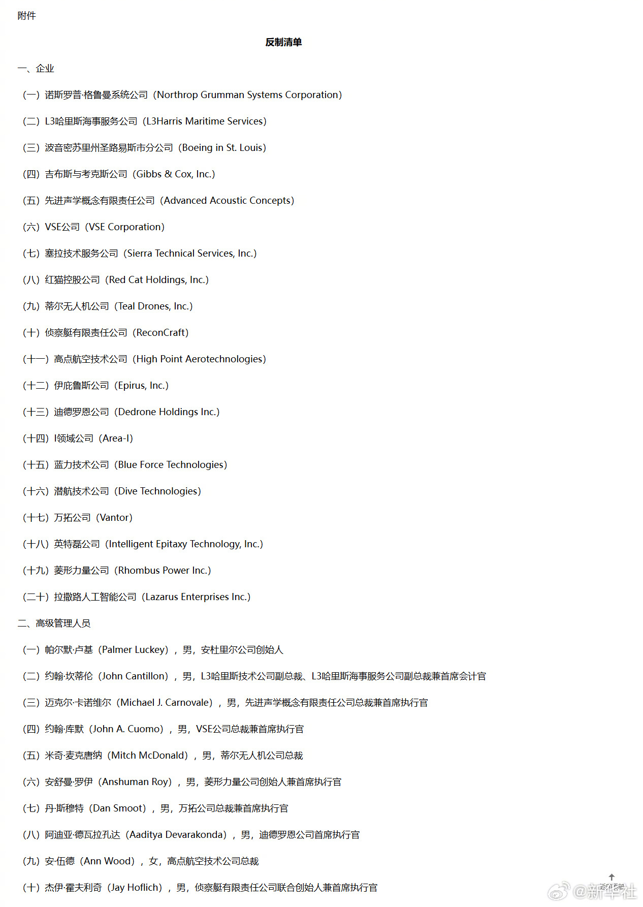 #中方决定反制美方军工相关企业及高管#【关于对美国军工相关企业及高级管理人员采取反制措施的决定】#中方反制20家美军工相关企业#(2025年12月26日中华人民共和国外交部令第19号公布,自2025年12月26日起施行)美国近日宣布向中国台湾地区大规模出售武器,严重违反一个中国原则和中美三个联合公报,严重干涉中国内政,严重损害中国主权和领土完整。依据《中华人民共和国反外国制裁法》第三条、第四条、第五条、第六条、第九条、第十五条规定,中方决定对以下美国军工相关企业及高级管理人员采取反制措施:一、对诺斯罗普·格鲁曼系统公司、L3哈里斯海事服务公司、波音密苏里州圣路易斯市分公司、吉布斯与考克斯公司、先进声学概念有限责任公司、VSE公司、塞拉技术服务公司、红猫控股公司、蒂尔无人机公司、侦察艇有限责任公司、高点航空技术公司、伊庇鲁斯公司、迪德罗恩公司、I领域公司、蓝力技术公司、潜航技术公司、万拓公司、英特磊公司、菱形力量公司、拉撒路人工智能公司等20家后附《反制清单》列明的企业,冻结在我国境内的动产、不动产和其他各类财产;禁止我国境内的组织、个人与其进行有关交易、合作等活动。二、对帕尔默·卢基(安杜里尔公司创始人)、约翰·坎蒂伦(L3哈里斯技术公司副总裁、L3哈里斯海事服务公司副总裁兼首席会计官)、迈克尔·卡诺维尔(先进声学概念有限责任公司总裁兼首席执行官)、约翰·库默(VSE公司总裁兼首席执行官)、米奇·麦克唐纳(蒂尔无人机公司总裁)、安舒曼·罗伊(菱形力量公司创始人兼首席执行官)、丹·斯穆特(万拓公司总裁兼首席执行官)、阿迪亚·德瓦拉孔达(迪德罗恩公司首席执行官)、安·伍德(高点航空技术公司总裁)、杰伊·霍夫利奇(侦察艇有限责任公司联合创始人兼首席执行官)等10名后附《反制清单》列明的企业高级管理人员,冻结在我国境内的动产、不动产和其他各类财产;禁止我国境内的组织、个人与其本人进行有关交易、合作等活动;对其本人不予签发签证、不准入境(包括香港、澳门)。本决定自2025年12月26日起施行。 外交部 2025年12月26日(新华社)