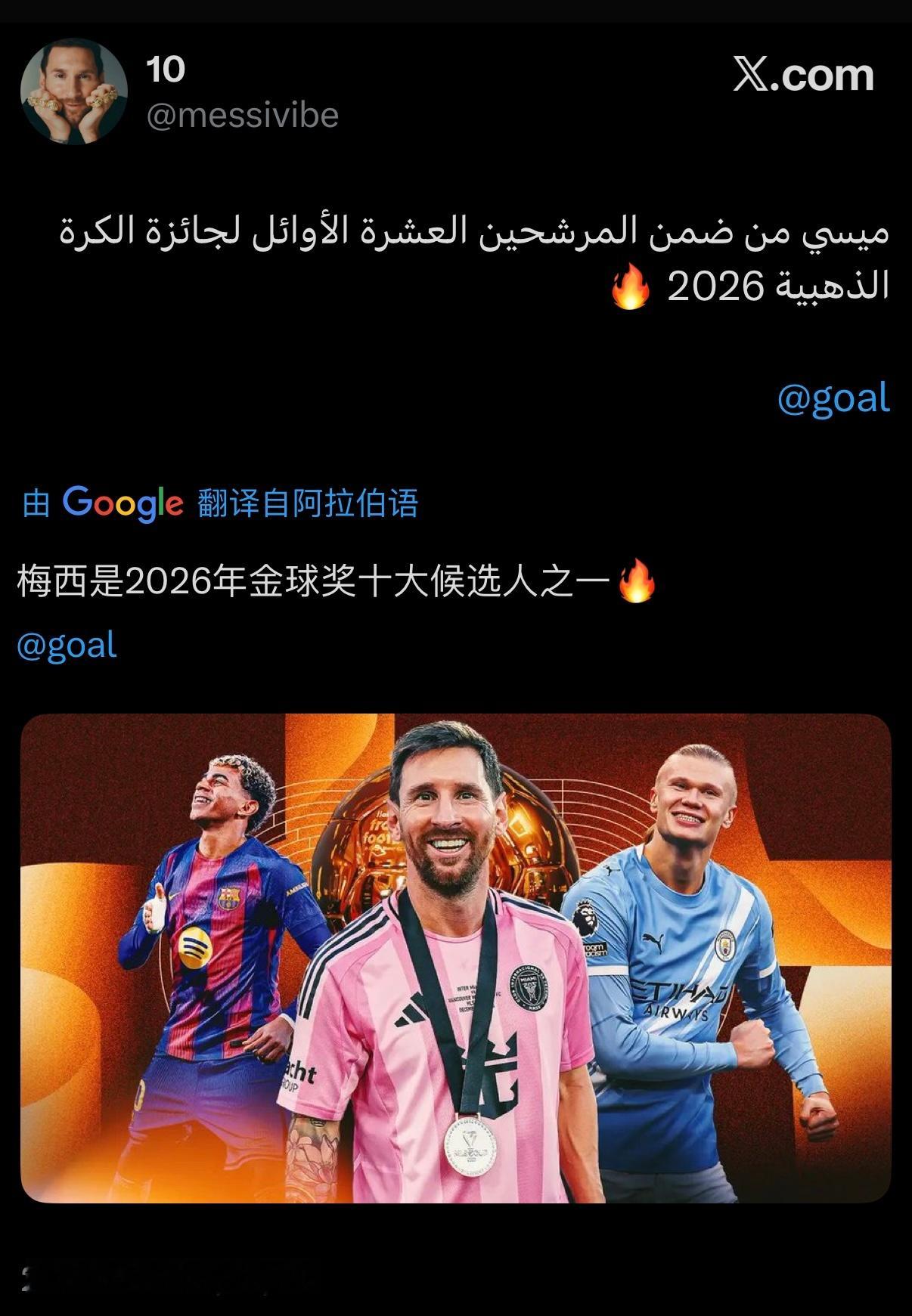 梅西入围2026年金球奖十强候选名单(GOAL)