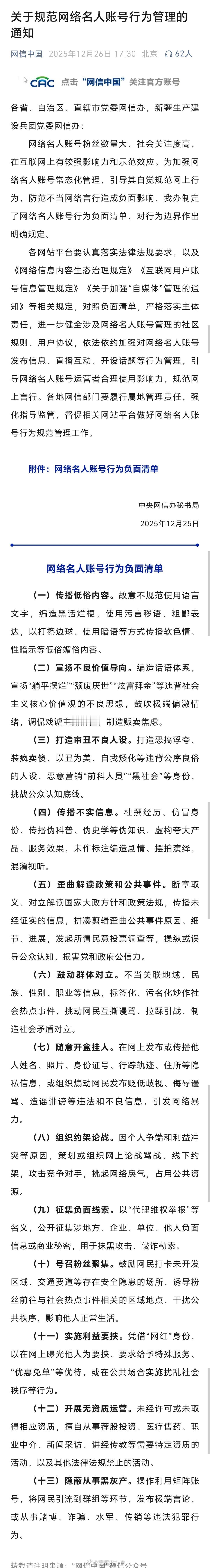 网络名人账号行为负面清单关于规范网络名人账号行为管理的通知