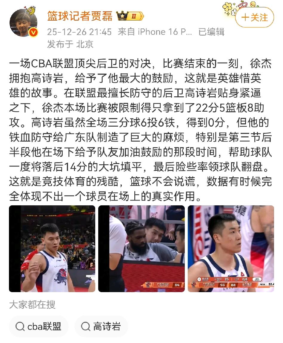 高诗岩也别怪人家记者贾磊总是阴阳怪气你,实在是太不争气了! 高诗岩哪有国家队首发控卫的样子,投篮6中0都被广东队放空了让他投都不进,这样的水平能进国家队还打首发能赢可太难了。 有人说徐杰和高诗岩选谁进国家队都有情可原,看教练是注重防守还是进攻,选国家队后卫哪能选完全没有篮的铁匠呢,就高诗岩一米八多的身高能真防住谁。 郭士强给徐杰一个机会吧,多给一些球权试试看行不行。